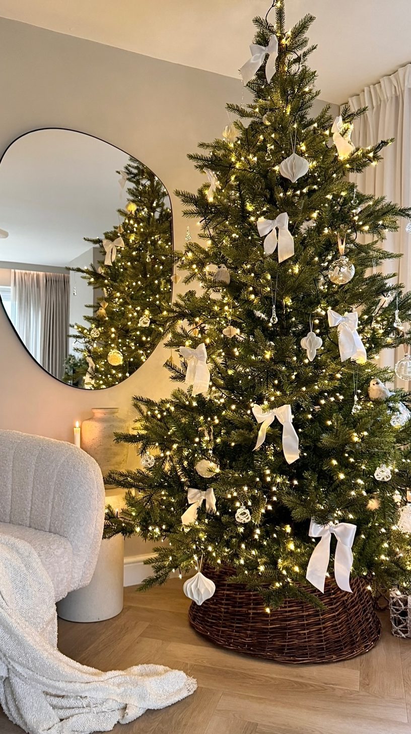Tiny lights scattered through the branches give the tree a quiet glow. They’re subtle enough to not compete with the bow but warm enough to complement its neutral white tone. The tree sits in a textured, pale stone pot that keeps the look clean and modern.