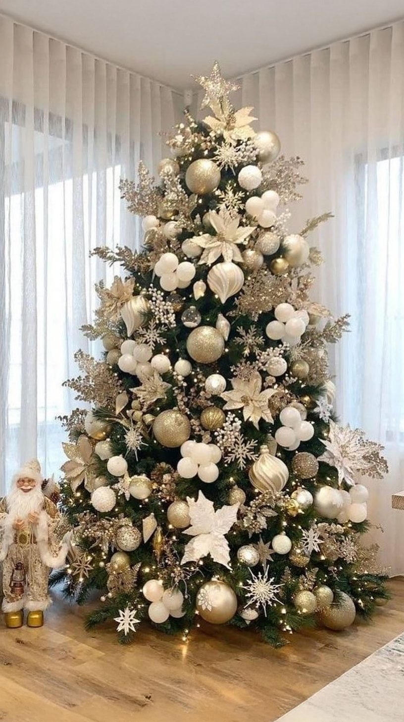 The ornaments bring in a mix of metallics—gold, champagne, and silver—and soft textures like matte white spheres. It’s a balance that’s festive without being overwhelming.