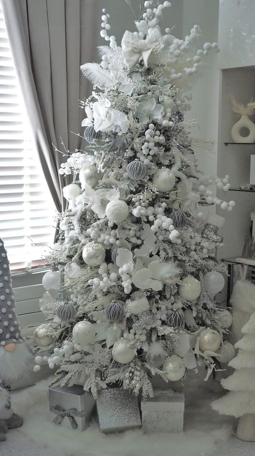 Every inch of this tree is covered in bright white ornaments, flowers, and frosted details, creating a shimmering snowy effect. Pops of silver from glittery baubles and wrapped gifts at the base give it just enough contrast without breaking the monochromatic theme.