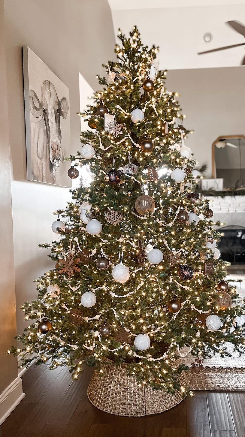 Warm white lights wrap tightly around the branches of this Christmas tree, creating a soft glow. The ornaments are simple and understated, combining earthy browns and creamy whites. There’s a mix of textures—matte, woven, and glittered—that give a polished but natural look.