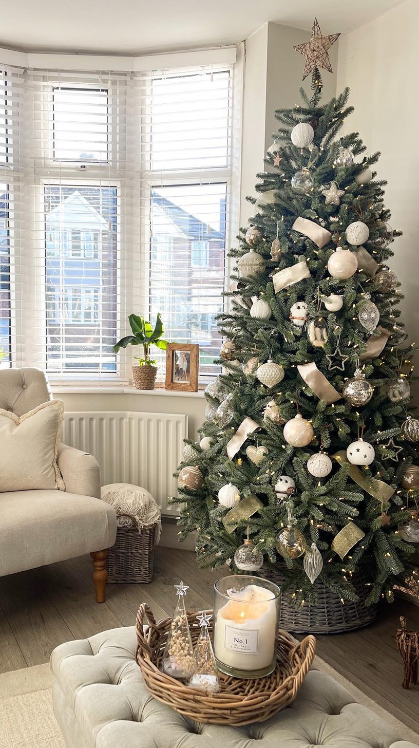 Golden ribbons and creamy white ornaments catch your eye first. The Christmas tree is packed with shimmering baubles, textured decorations, and subtle hints of metallics. A woven basket base adds a grounded, natural touch beneath the elegance.