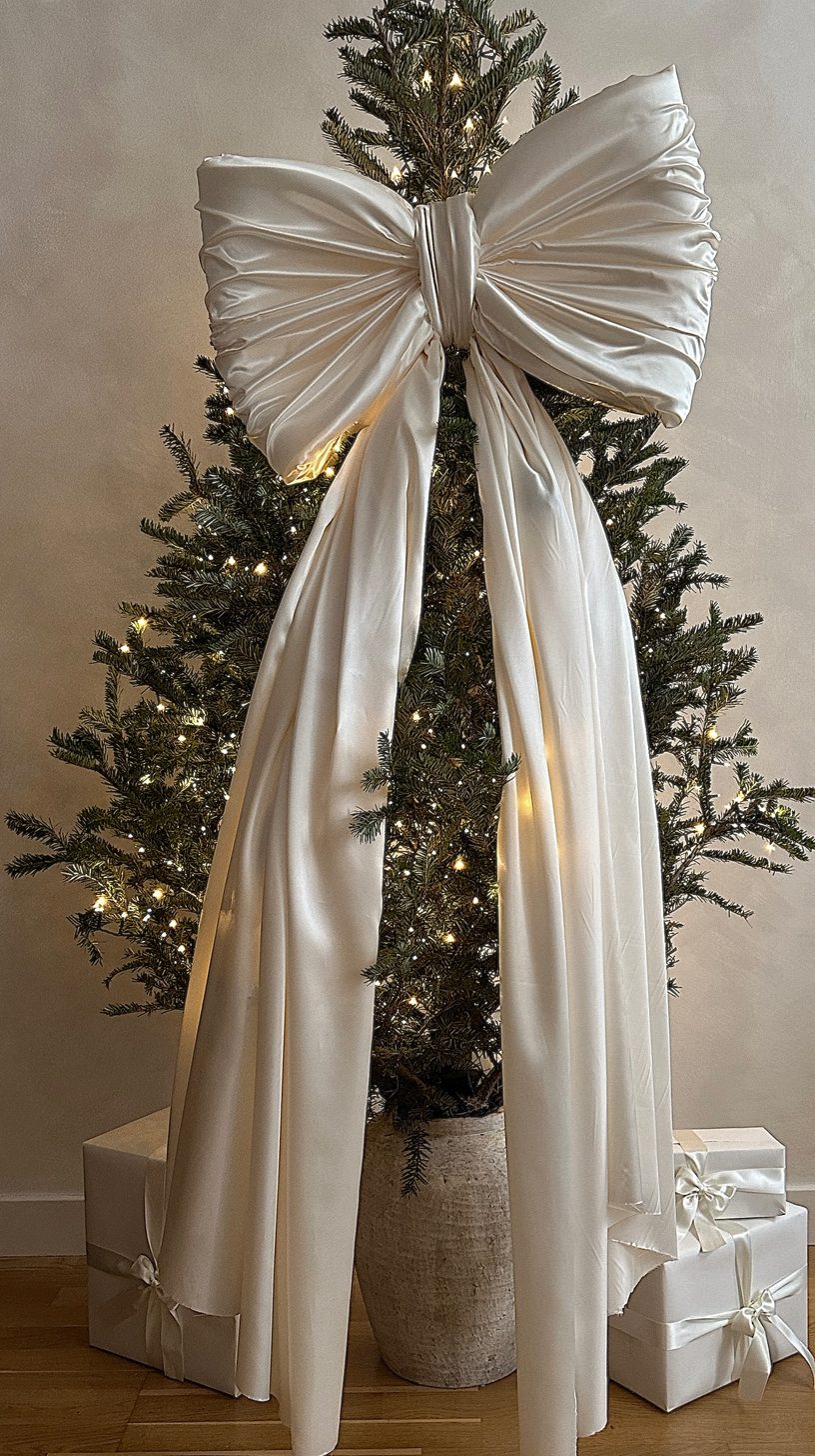 The massive white satin bow grabs your attention immediately. It’s draped across the top of this small evergreen tree, with dramatically long tails cascading down almost to the base. The texture of the fabric has a soft, polished sheen that contrasts its natural setting.