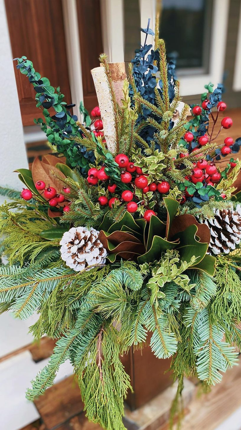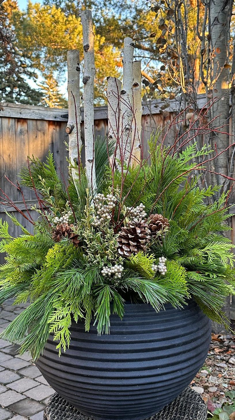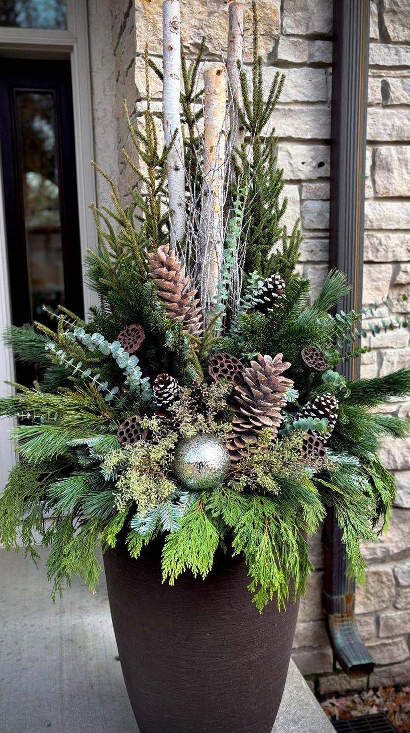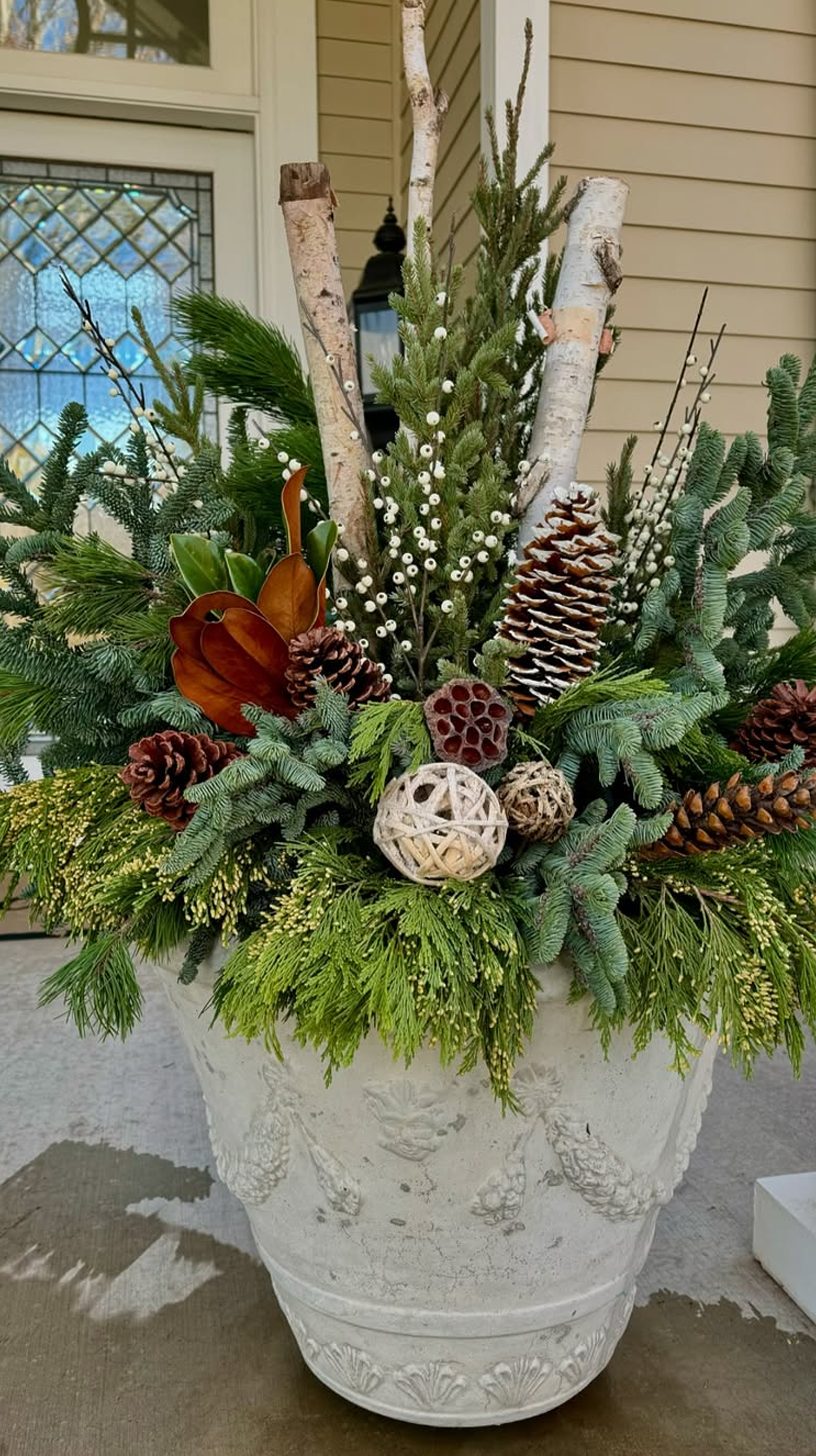 Tall birch branches draw the eye upward, giving this planter a natural and elegant height. The mix of pine, cedar, and other evergreen sprigs creates a lush, textured base. Subtle touches of red twigs and frosted pinecones add a wintery feel without overdoing it.