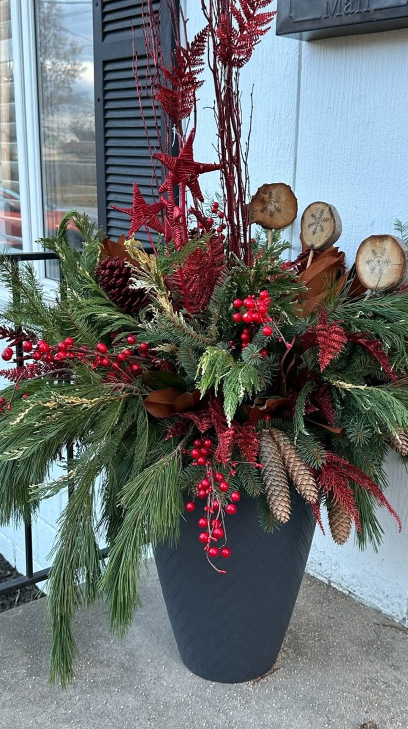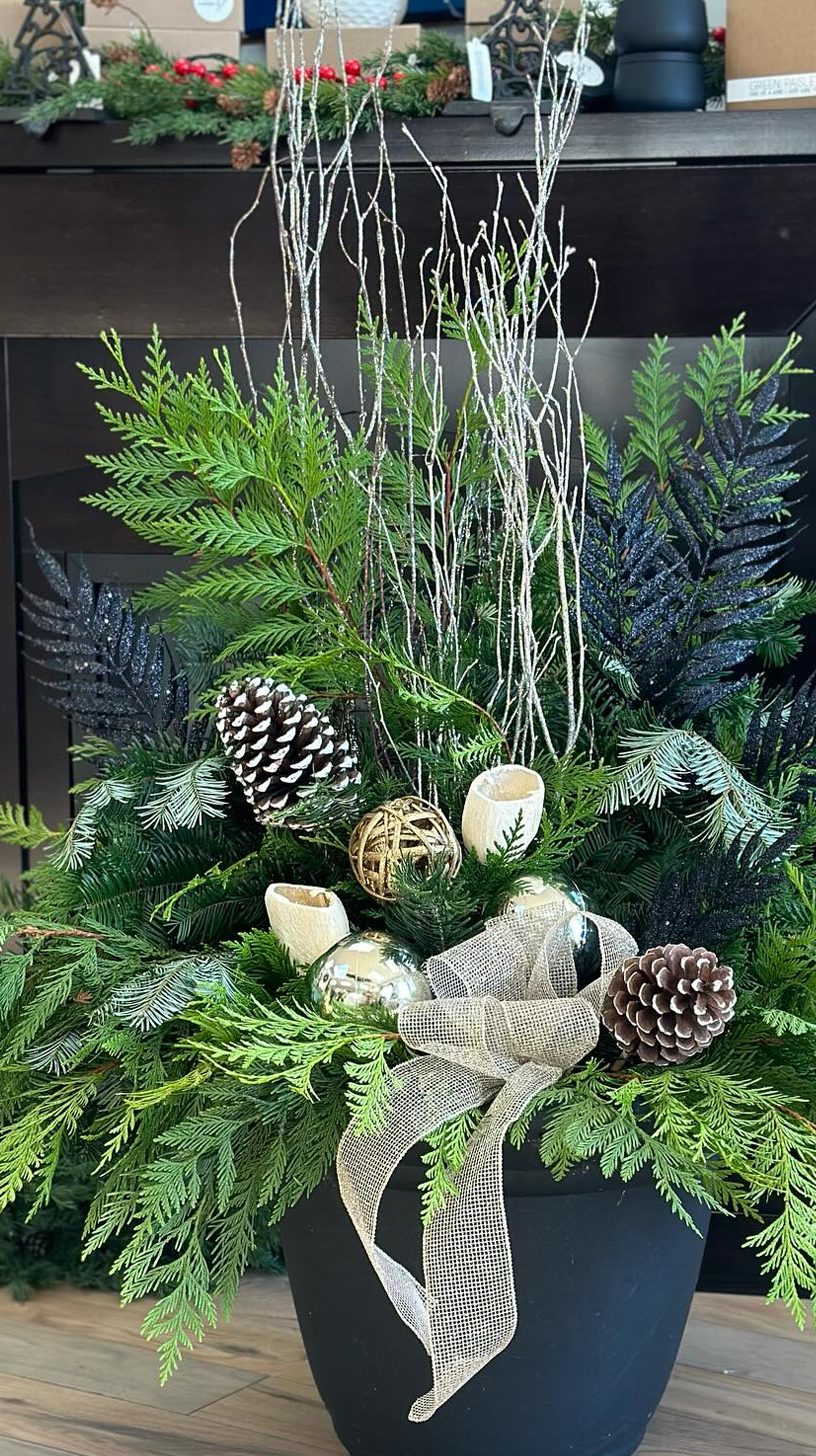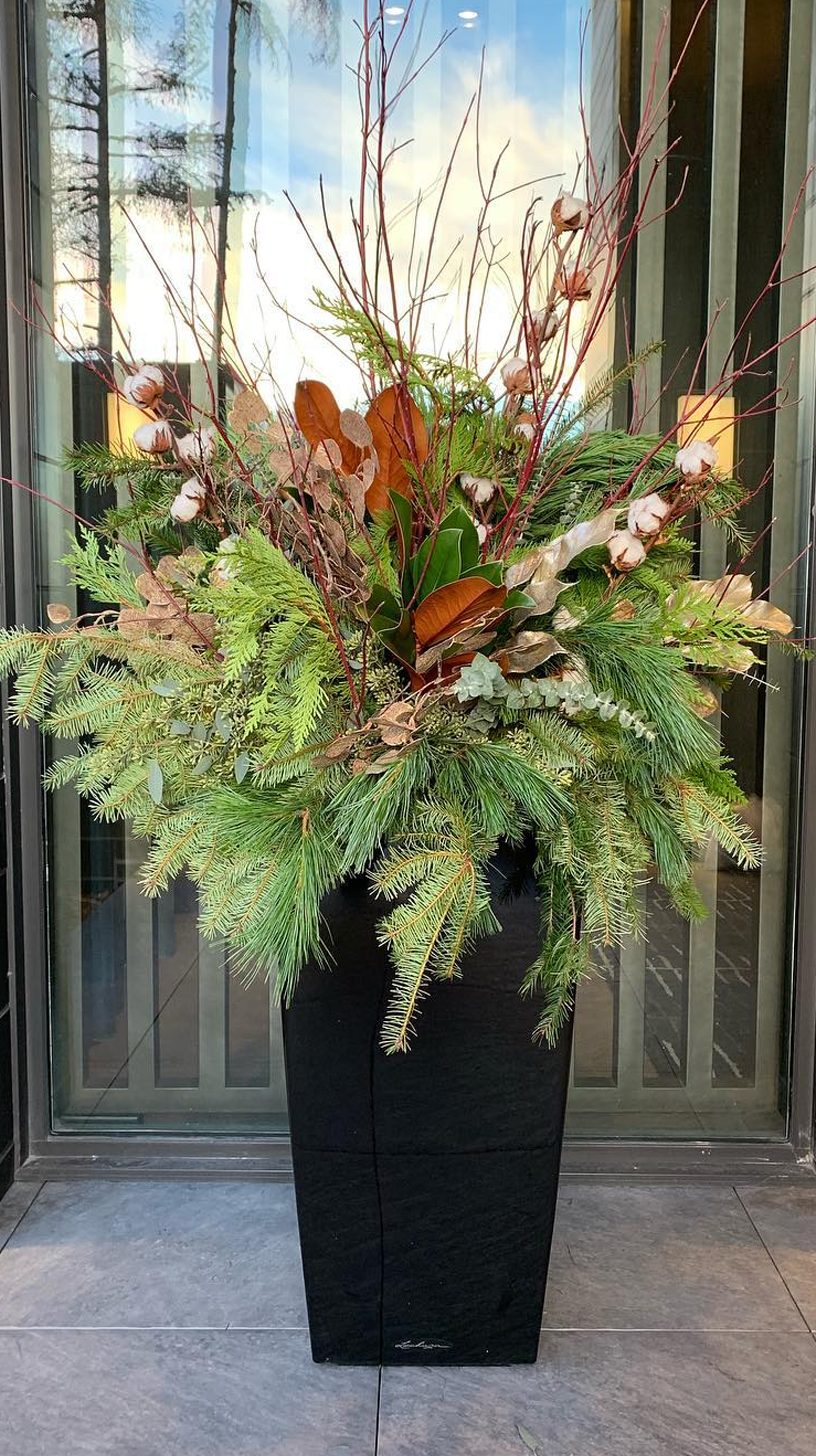 Tall birch branches draw the eye upward, giving this planter a natural and elegant height. The mix of pine, cedar, and other evergreen sprigs creates a lush, textured base. Subtle touches of red twigs and frosted pinecones add a wintery feel without overdoing it.