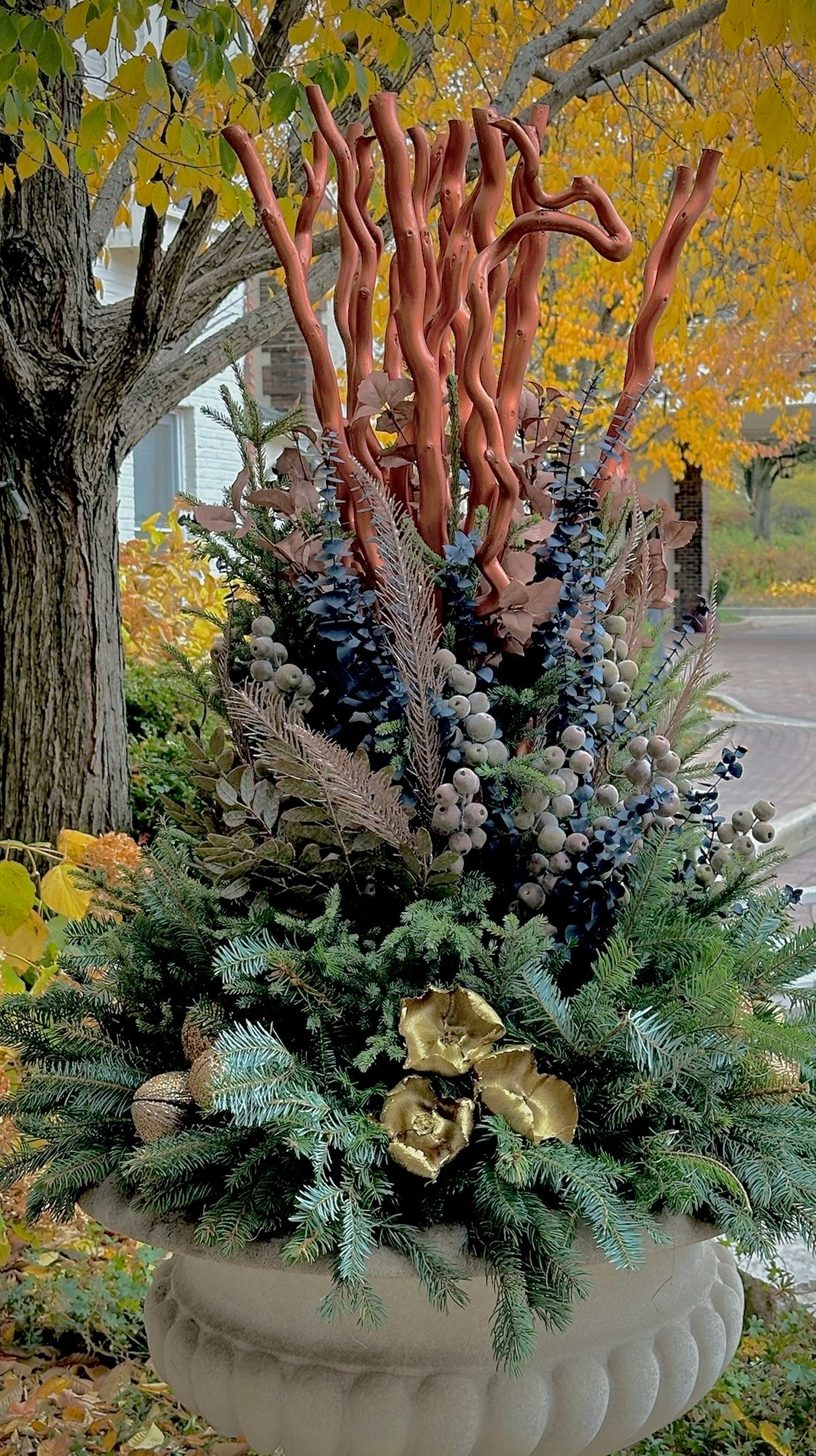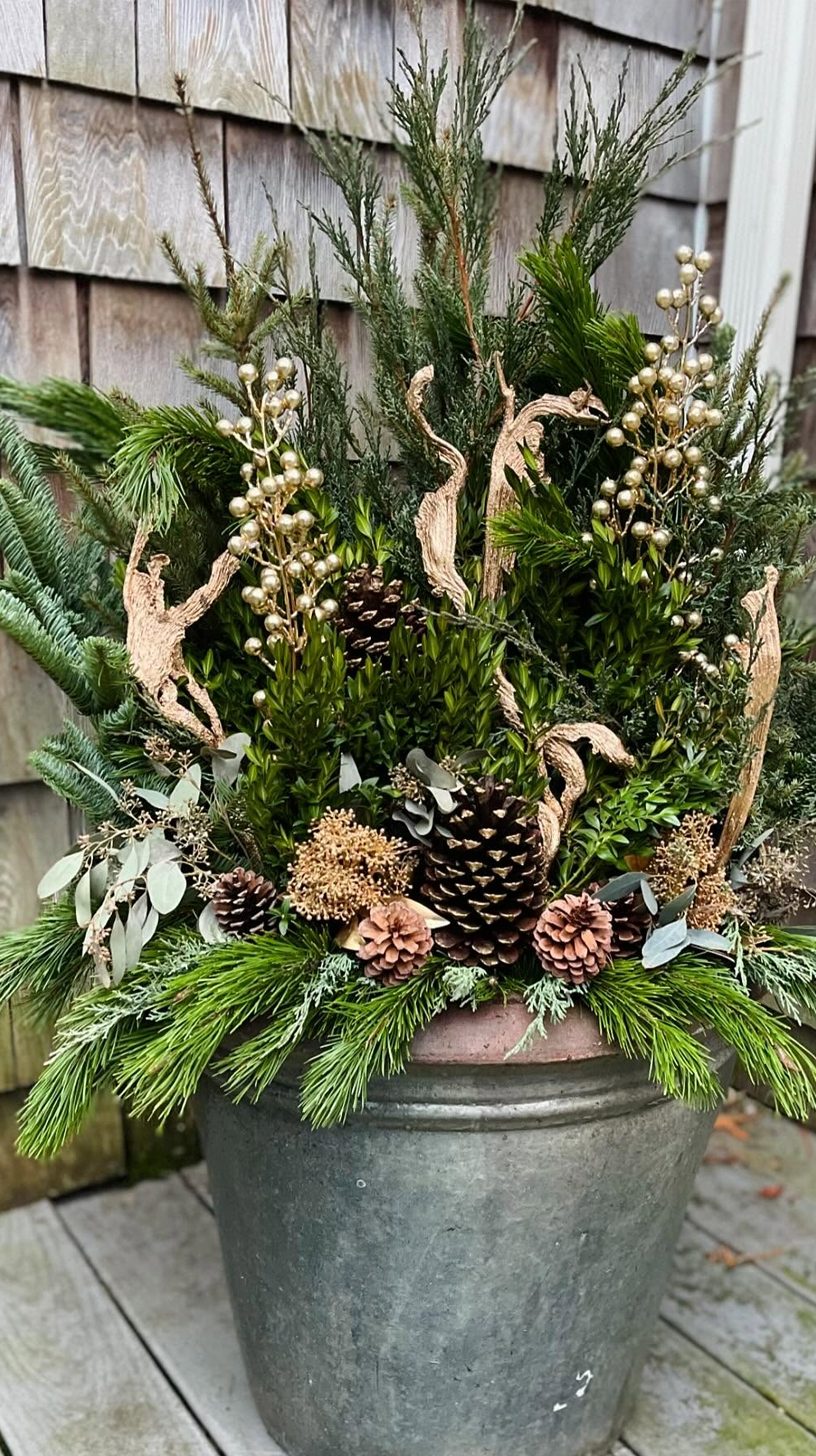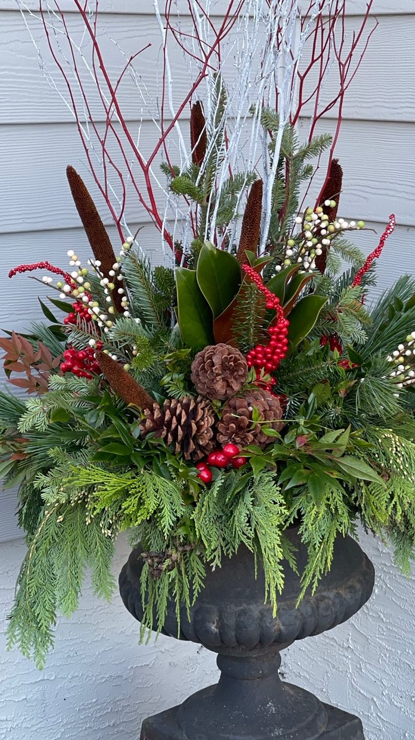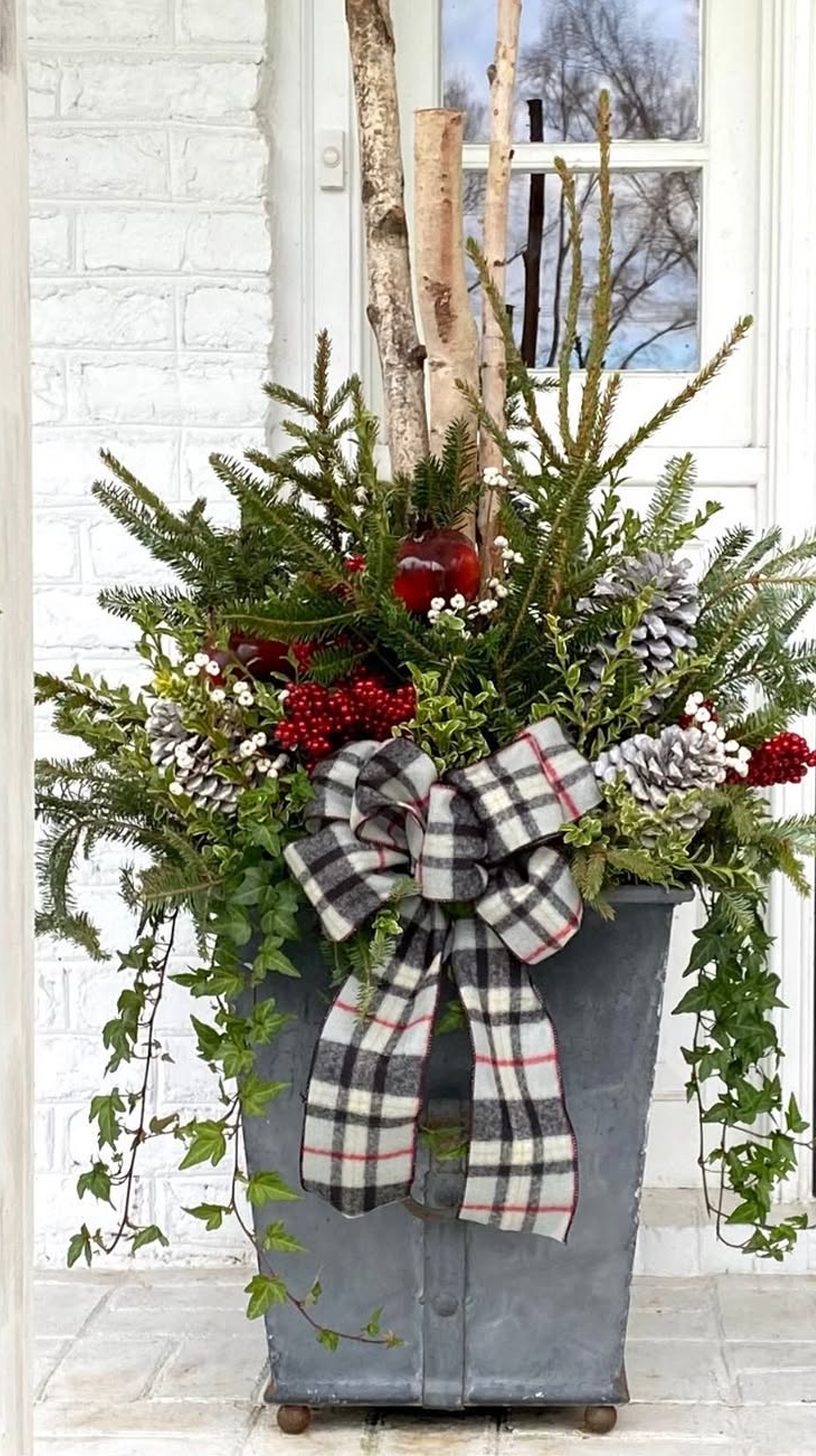 Tall birch branches draw the eye upward, giving this planter a natural and elegant height. The mix of pine, cedar, and other evergreen sprigs creates a lush, textured base. Subtle touches of red twigs and frosted pinecones add a wintery feel without overdoing it.