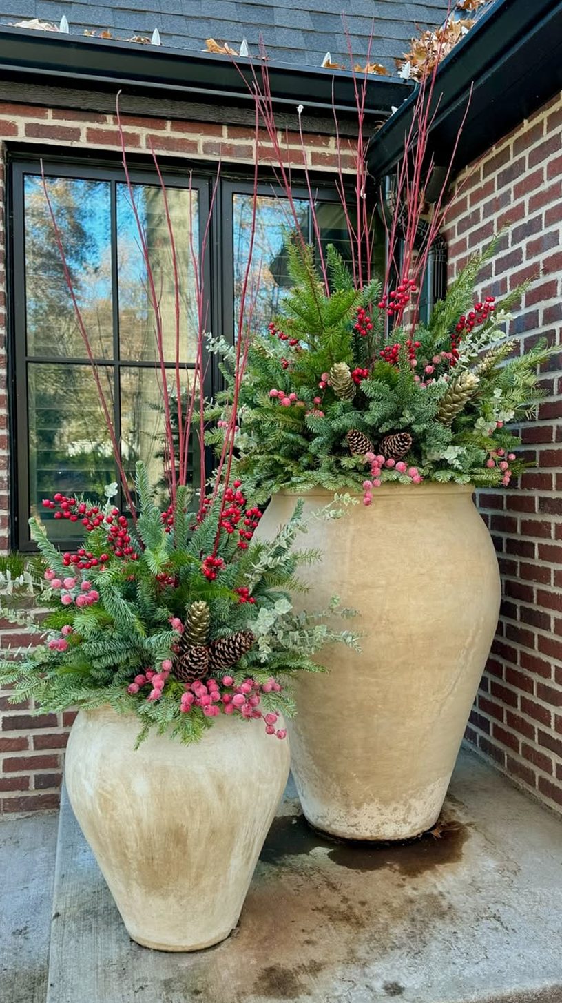Vibrant red branches grab your attention first. There’s a striking mix of greenery and berries that fills two oversized pots, one larger than the other. Pinecones are nestled snugly among the red and pink berries, adding a touch of rustic charm.