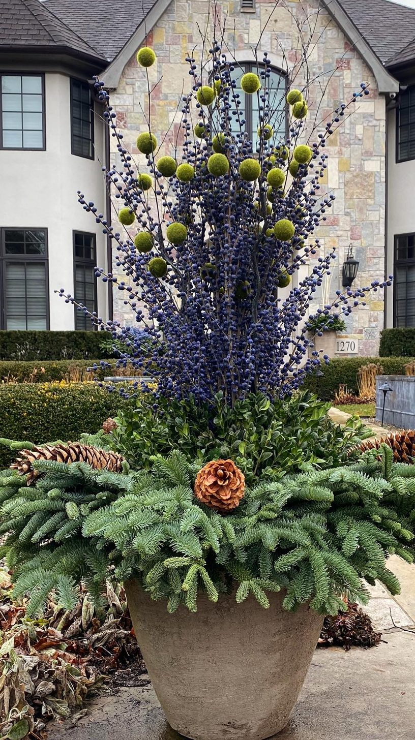 Bright green spheres pop among spiky blue branches, immediately catching your eye. This striking combination offers an unexpected mix of colors that feels bold yet refined. The arrangement sits in a large stone pot that grounds the display with its natural, earthy texture. It’s the kind of setup that can transform an entryway or garden with a touch of modern flair.