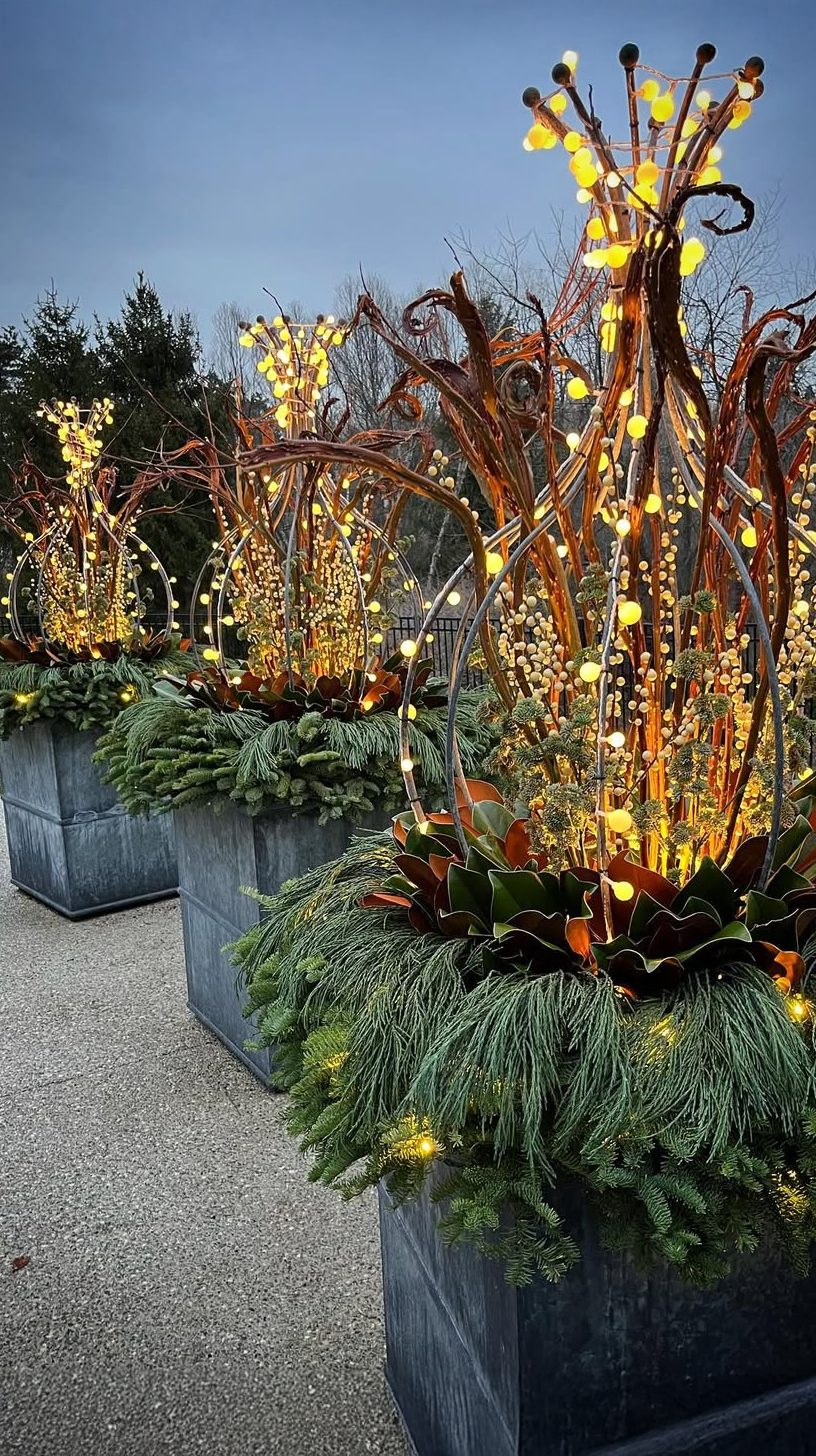 Strings of warm yellow lights twist around slender, elegant branches, giving off a magical glow as evening sets in. The arrangement stands tall in metallic gray planters, adding a modern touch. Evergreen foliage spills over the edges, providing a lush, textural base that grounds the display beautifully.