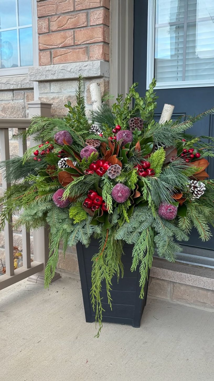 Rich purples and vibrant reds jump out from this large planter sitting on a porch. Frosted berries and textured pinecones add a wintry touch, making it feel both fresh and seasonal. The mix of evergreen branches gives it a lively, full look.
