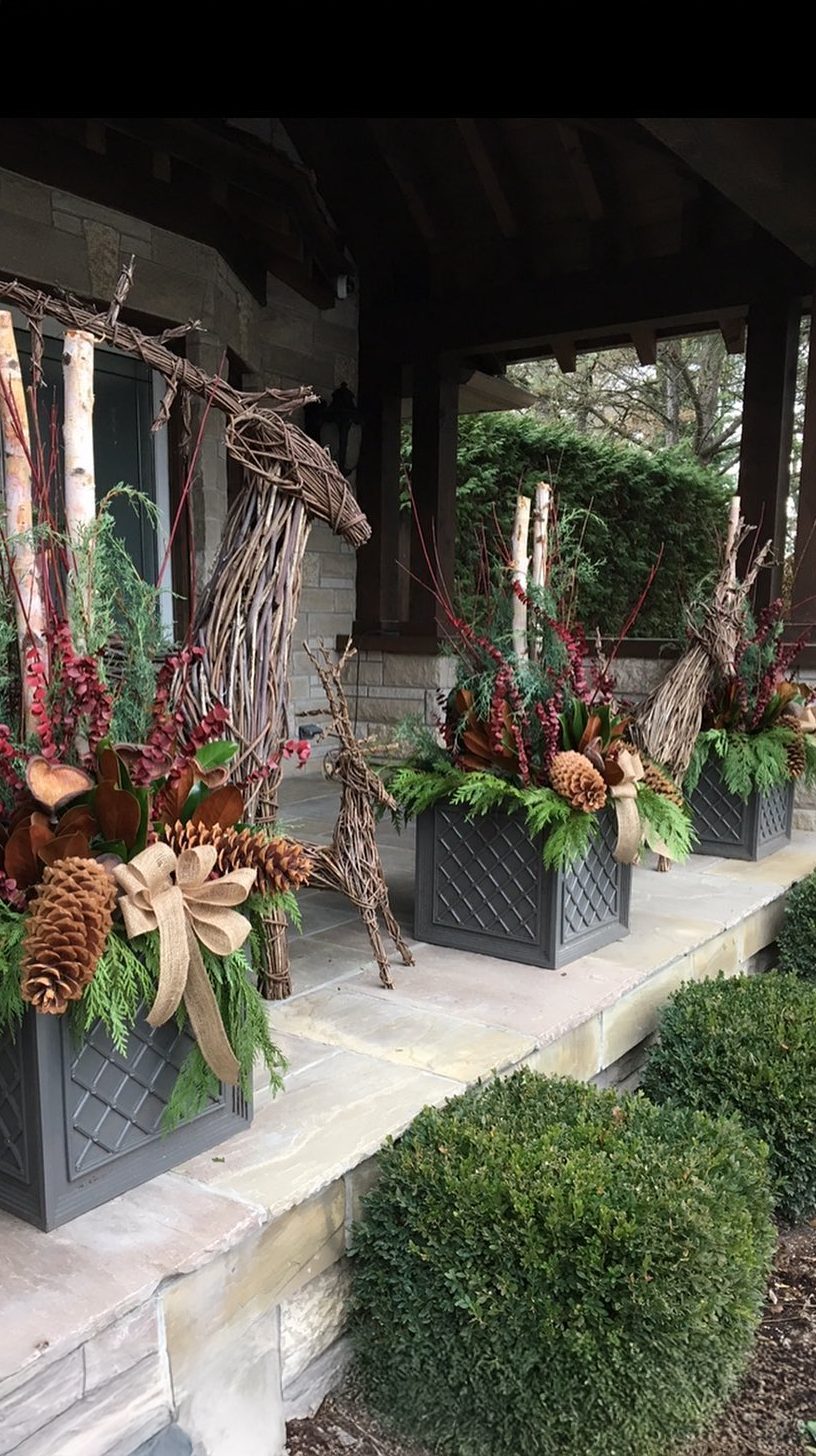 Natural textures take center stage with these rustic planters. Crafted from dark wood, they feature woven deer ornaments that stand out strikingly. Pinecones, lush greenery, and deep red accents add a touch of vibrancy without being overwhelming.