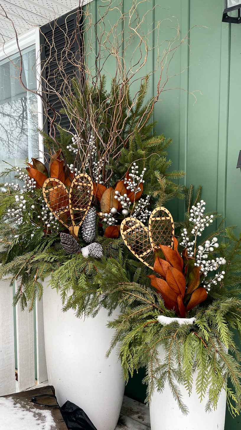 Right up front, snowshoes steal the show in these winter planters. They’re nestled in a mix of lush greenery that adds vibrant texture against the white backdrop. The branches twist elegantly upward, creating an almost sculptural look.