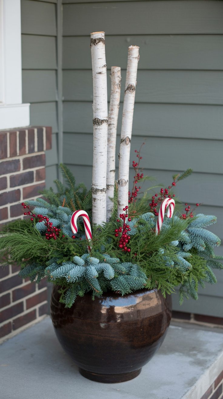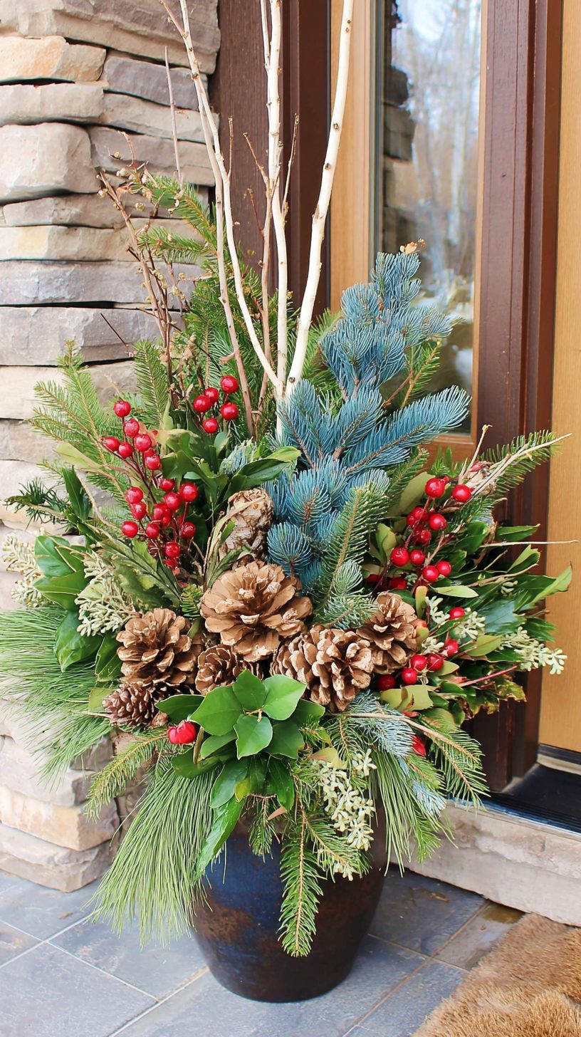 Tucked against the house, a large planter holds a mix of birch branches and evergreens. The birch adds height, while the greenery brings a lush feel. Pine cones are nestled among the branches, giving it a woodsy appearance.