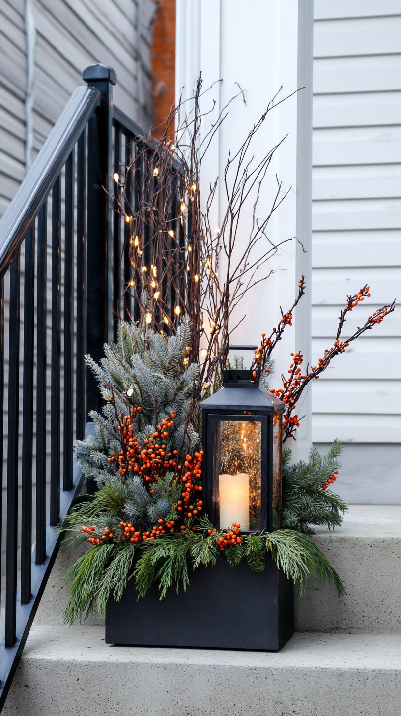 Cascades of vibrant orange berries pop against the deep green pine branches. They’re nestled in a sleek, black planter that sits snugly on a concrete step. It all feels modern yet grounded, like a crisp breath of winter air.