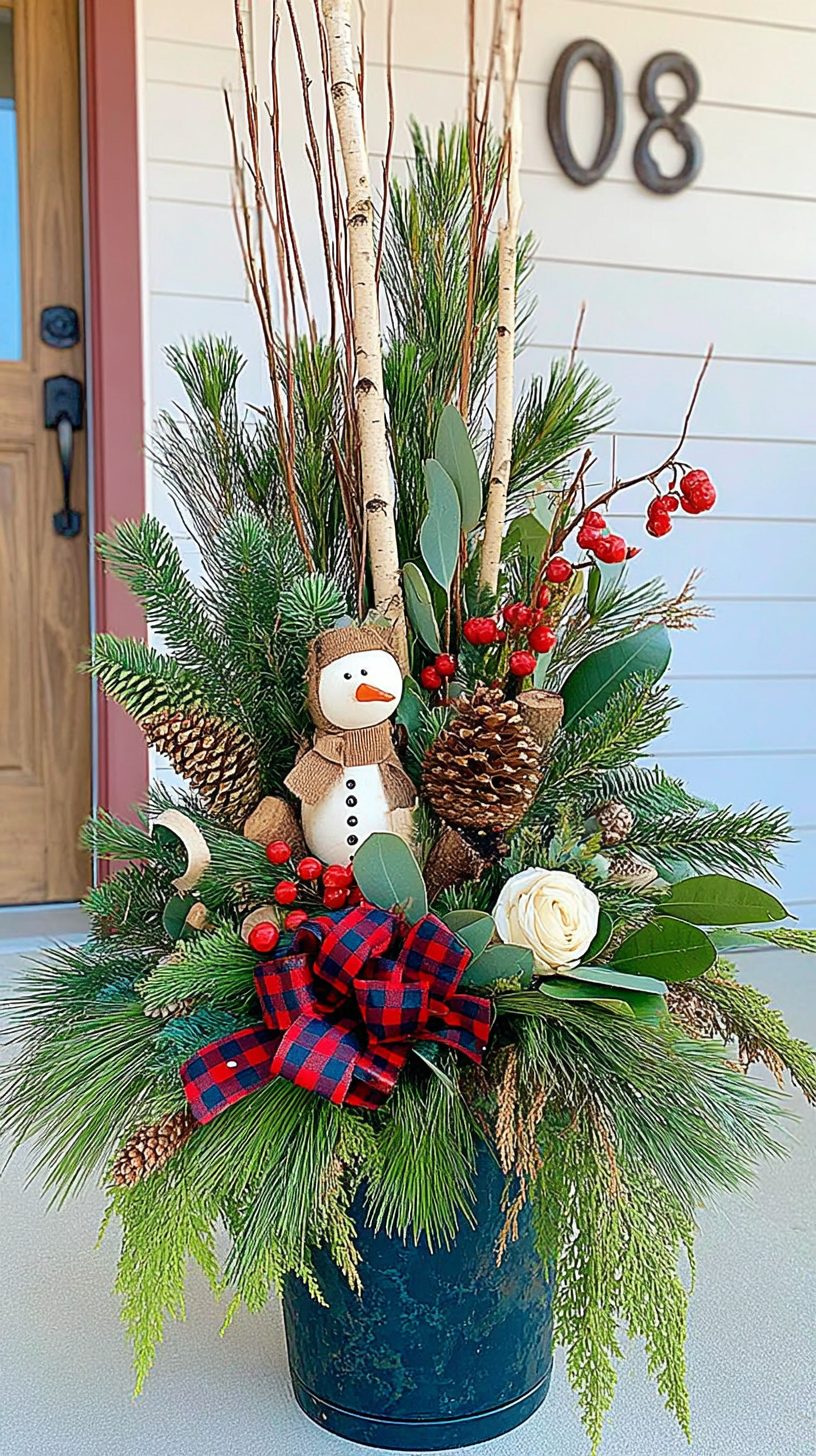 A cheerful snowman greets you right at the center of this arrangement, wrapped in a cozy burlap scarf. Surrounding him are lush green pine branches that offer a fresh, outdoorsy vibe. Red berries pop against the greenery, adding a vibrant touch that feels instantly festive.