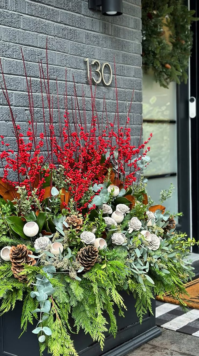Tall black planters catch the eye first, standing boldly against the light brick facade. They’re filled to the brim with lush greenery and striking red branches. The visual contrast between the deep red and the rich green creates a feeling of festive elegance.
