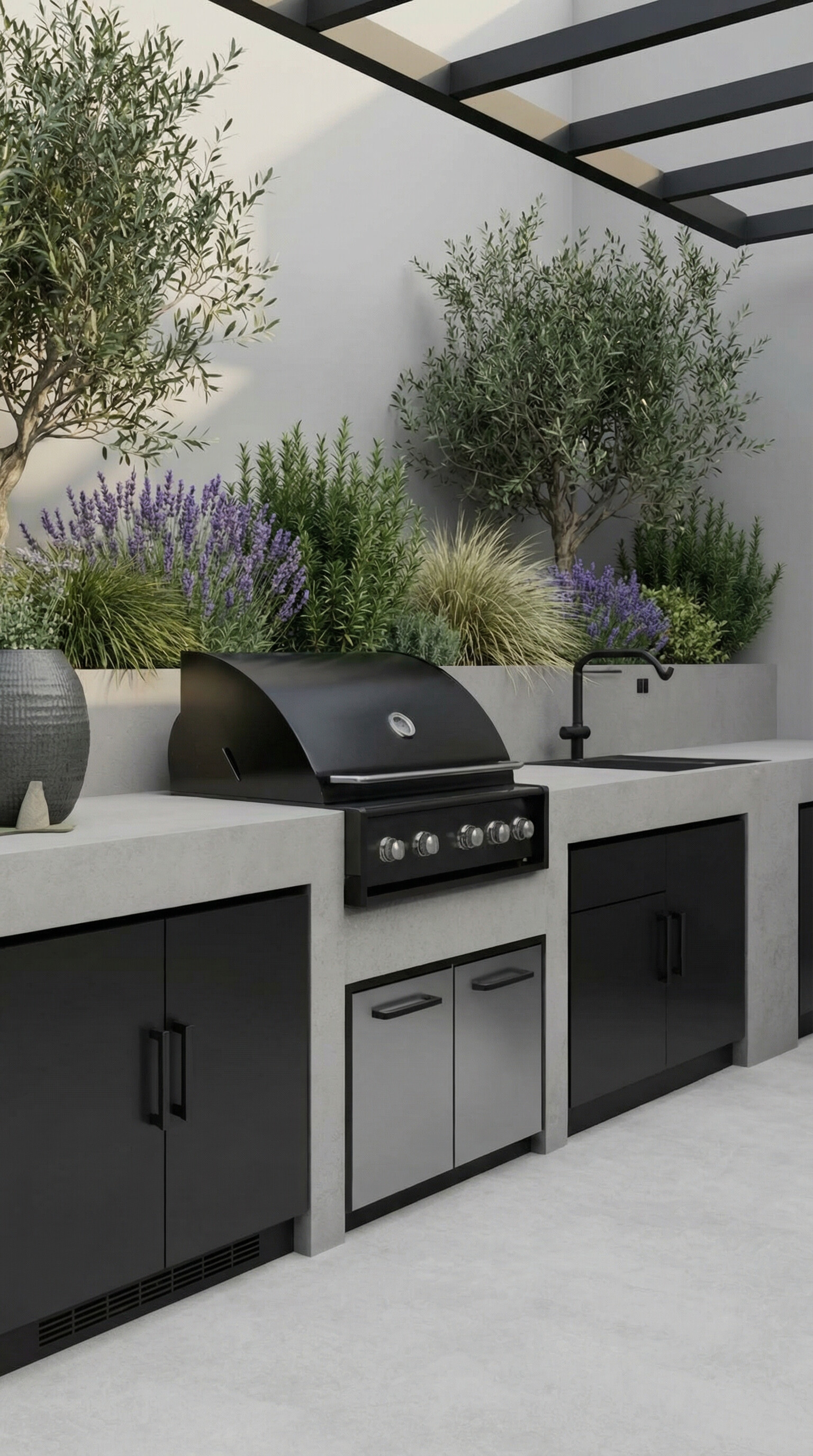 What stands out first is the sleek black grill tucked into the smooth counter. The modern design of the outdoor kitchen setup promises convenience and style.