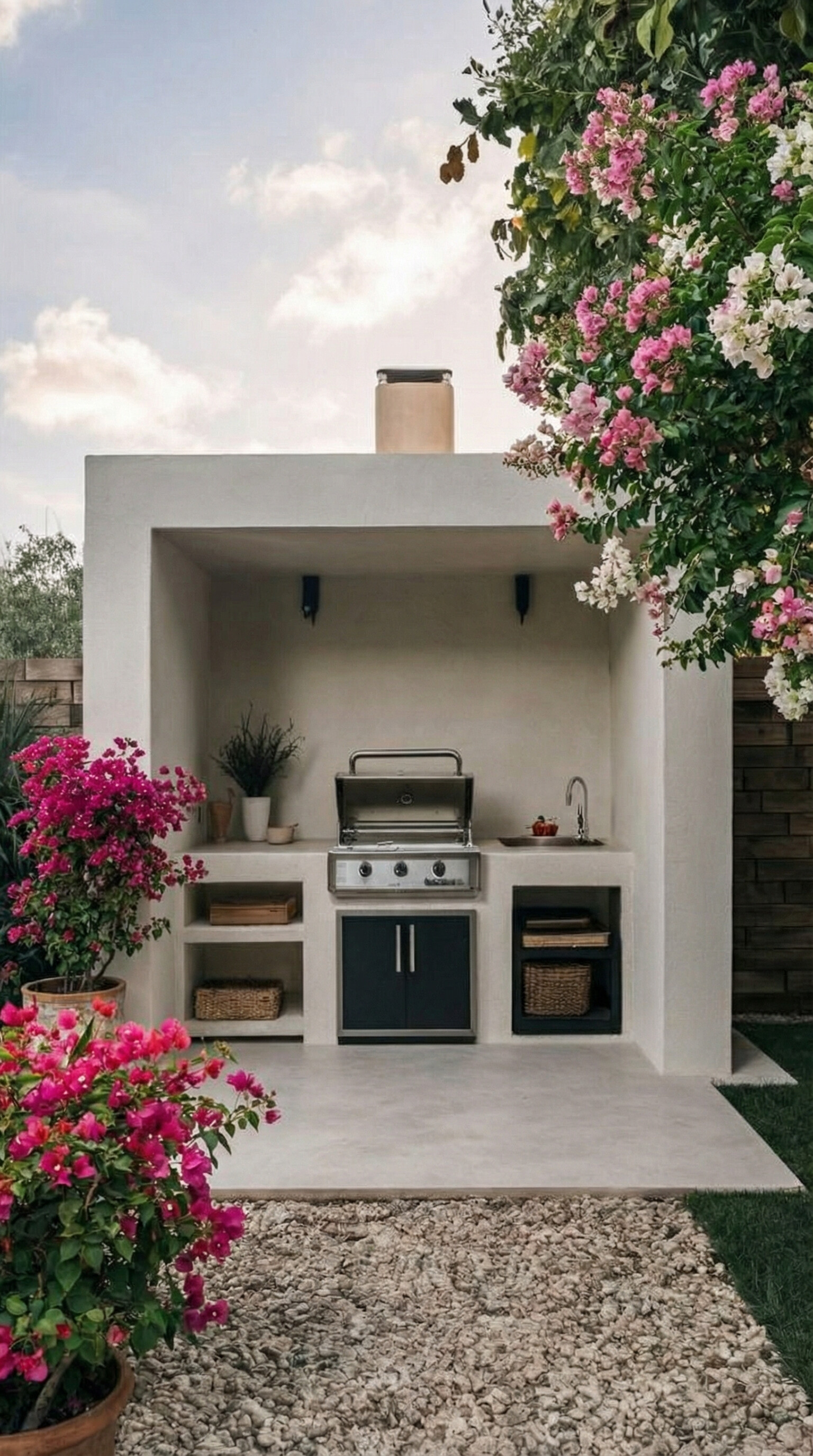 Bright pink bougainvillea adds a splash of color, framing the kitchen on both sides. The flowers contrast beautifully with the neutral tones of the setup. A stone path leads up, making the space inviting and grounded.
