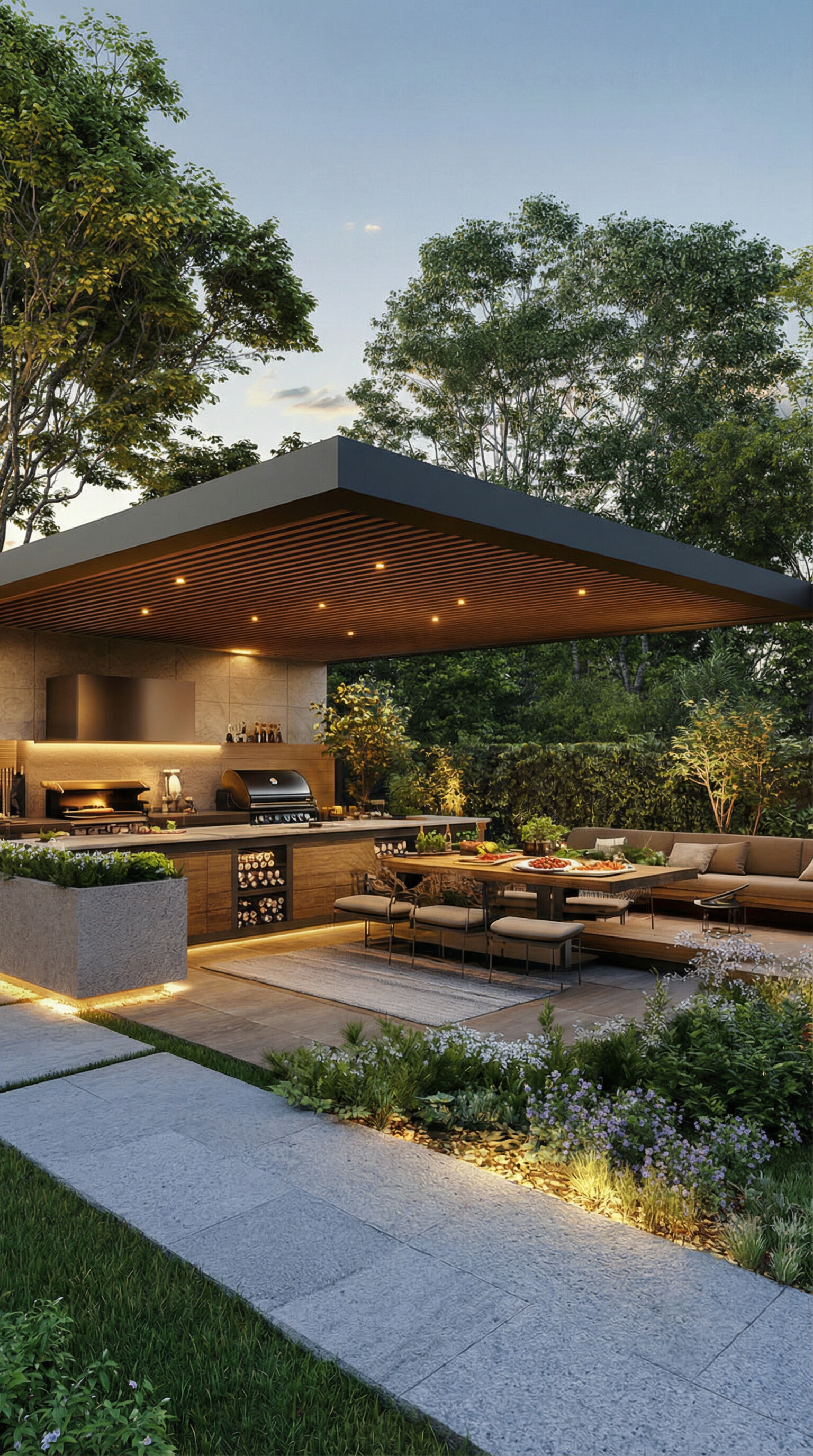 The sleek, modern canopy immediately grabs attention, providing a stylish cover for the outdoor kitchen area. Underneath, recessed lighting adds a warm, inviting glow that transitions perfectly from day to night. The design cleverly integrates nature, with greenery framing the space and adding life to the minimalist layout.
