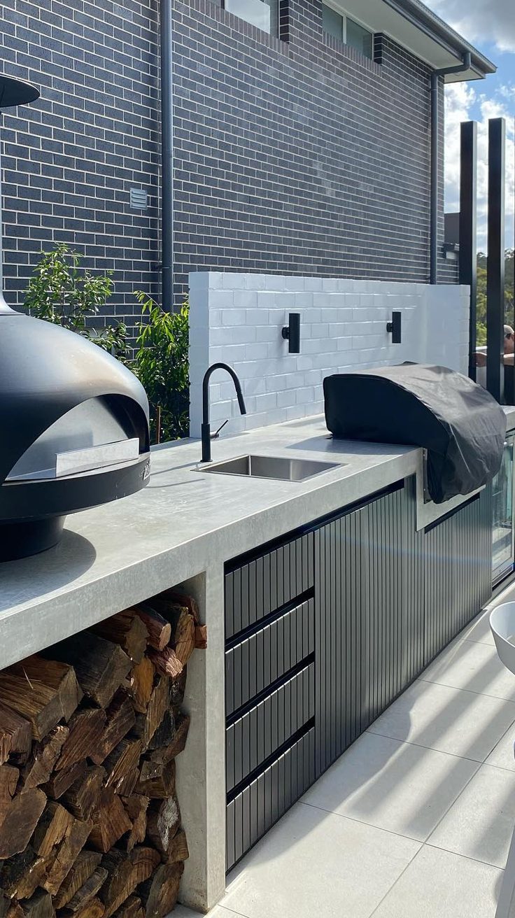 Black cabinets and appliances bring a polished look, while the concrete countertop adds a touch of industrial style. The black grill is neatly integrated, providing ample space for outdoor cooking. To the side, there’s a sleek, minimalistic black sink ready for any prep work or cleanup duties.