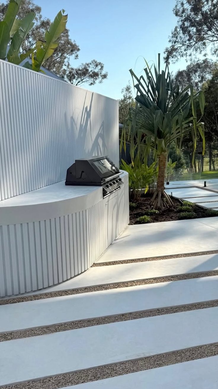 The curved lines of the white paneling create a sleek backdrop for the grill. It’s a modern space that feels both open and inviting. The dark grill contrasts sharply against the light structure, making it the focal point.