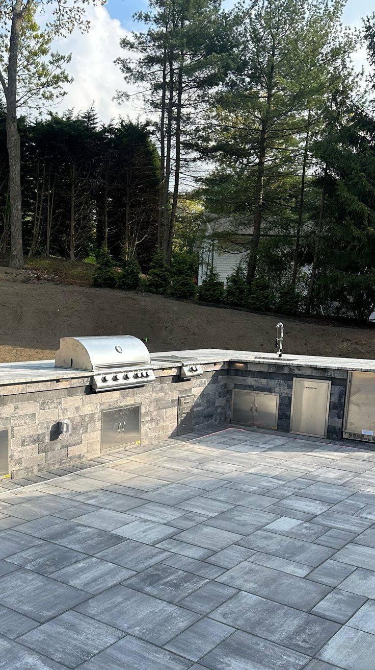 The surrounding trees provide a natural backdrop, giving this outdoor kitchen a touch of serenity. The paving stones on the ground are uniform and neat, providing a stable surface for hosting gatherings. It’s an inviting setup, perfect for those who love to cook and entertain outdoors while enjoying the view.