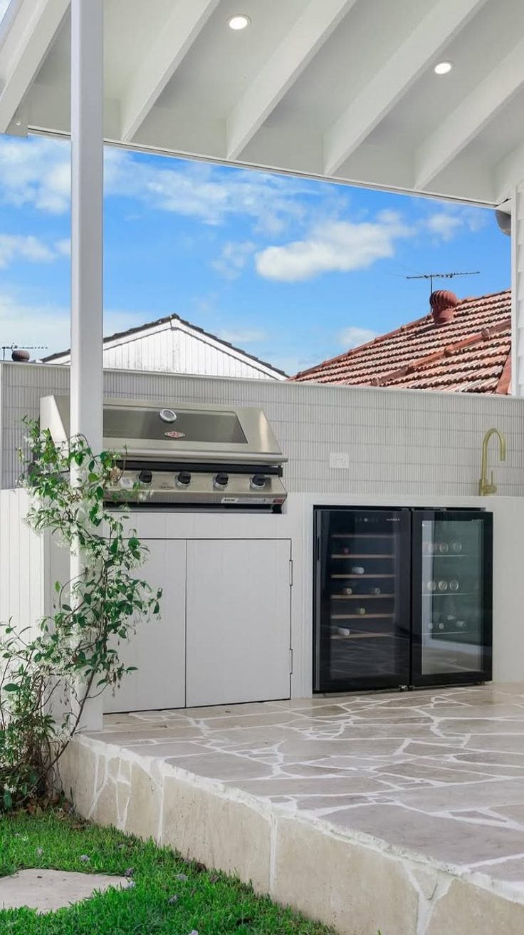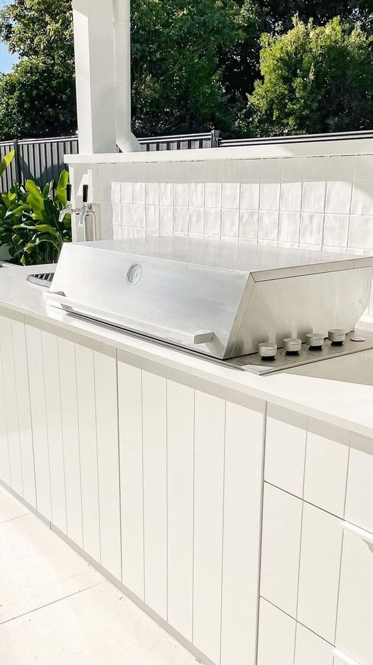 The white, tiled backsplash complements the minimalistic cabinetry, enhancing the airy vibe of the space. Simple knobs and a sturdy handle add functionality without cluttering the design. It’s a setup that makes outdoor cooking look effortless and stylish.