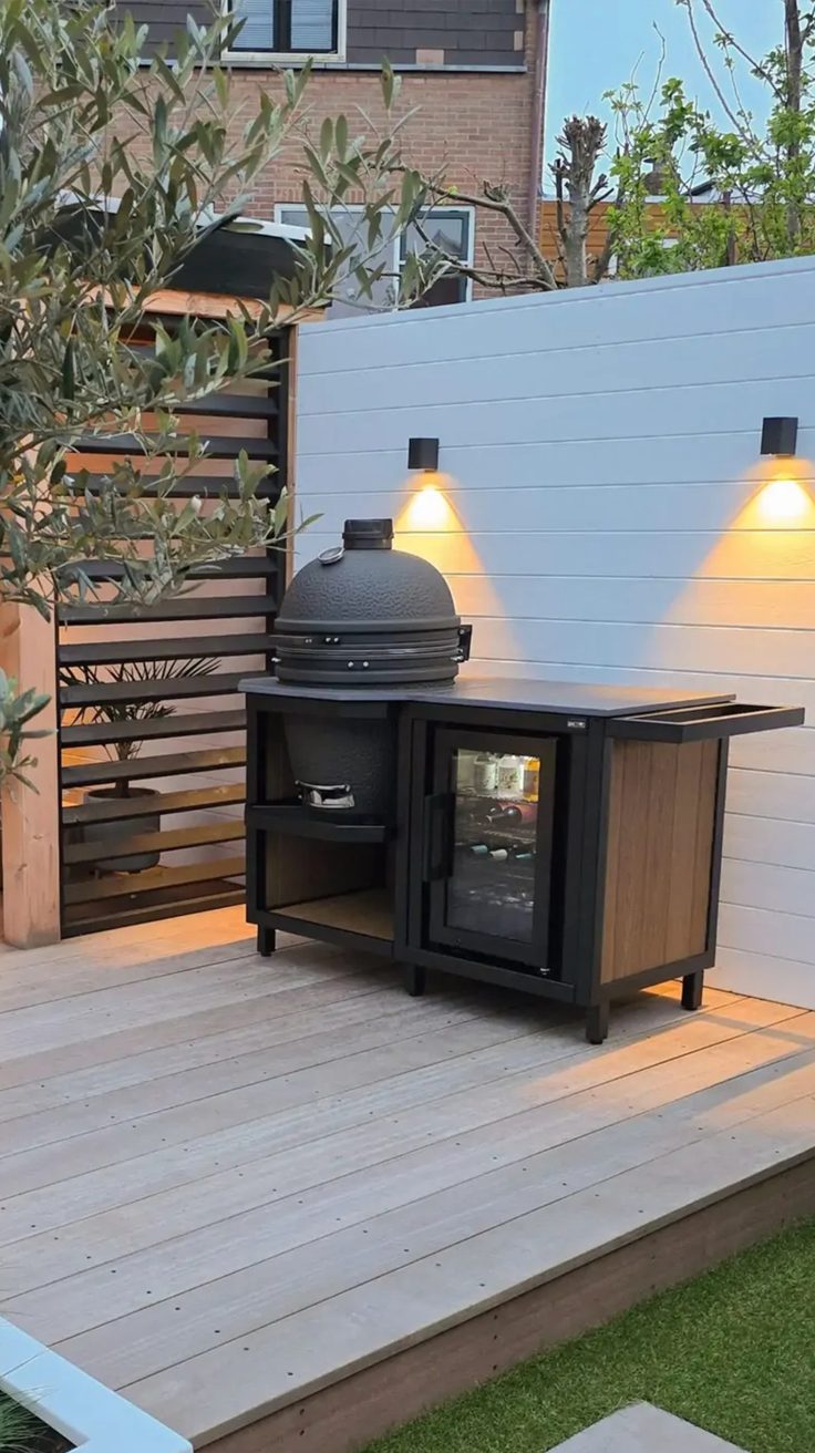 Gleaming against the modern backdrop, the dark Kamado grill stands ready for any grilling adventure. It’s set on a sturdy, sleek cabinet, featuring a compact fridge to keep your drinks chilled and easily accessible. The ambient glow from the stylish wall lights adds warmth to the scene, making it inviting for evening gatherings.
