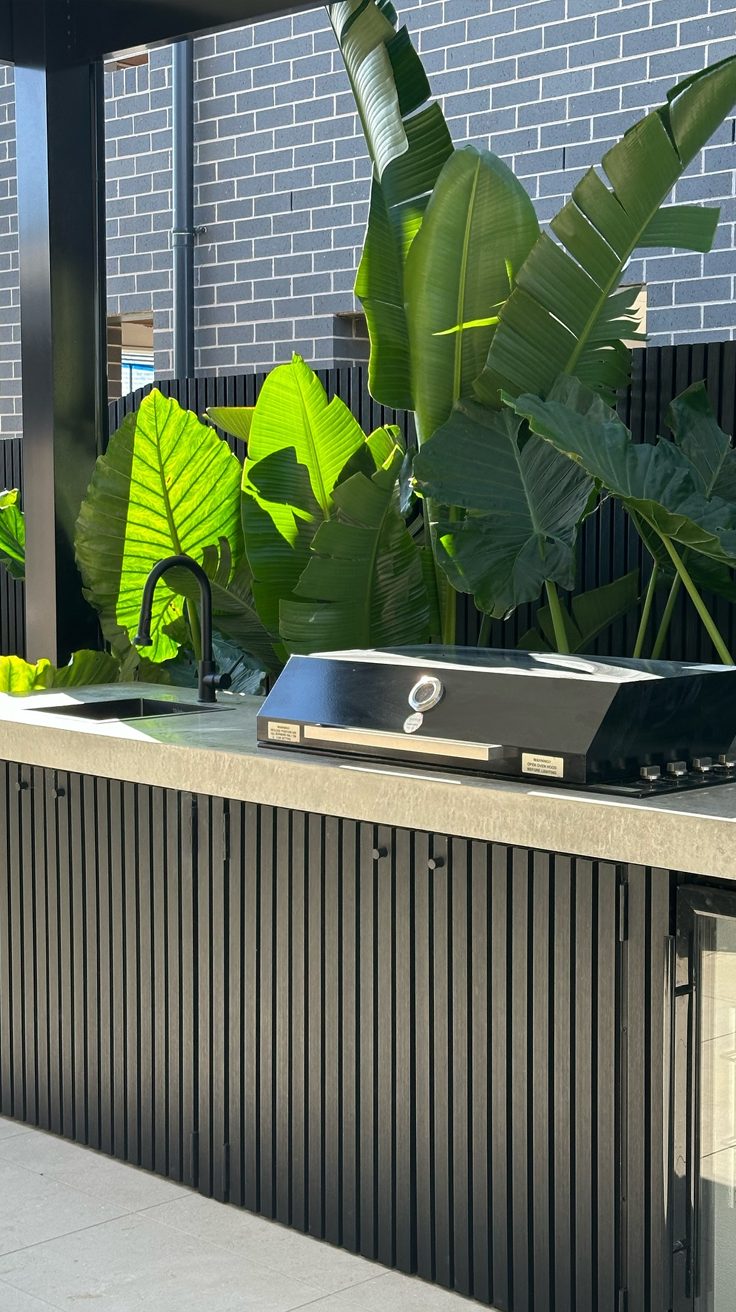Massive green leaves stand tall behind a striking black grill, adding a lively backdrop to the sleek setup. The dark vertical slats of the cabinetry below add texture and depth, creating a modern, sophisticated look.