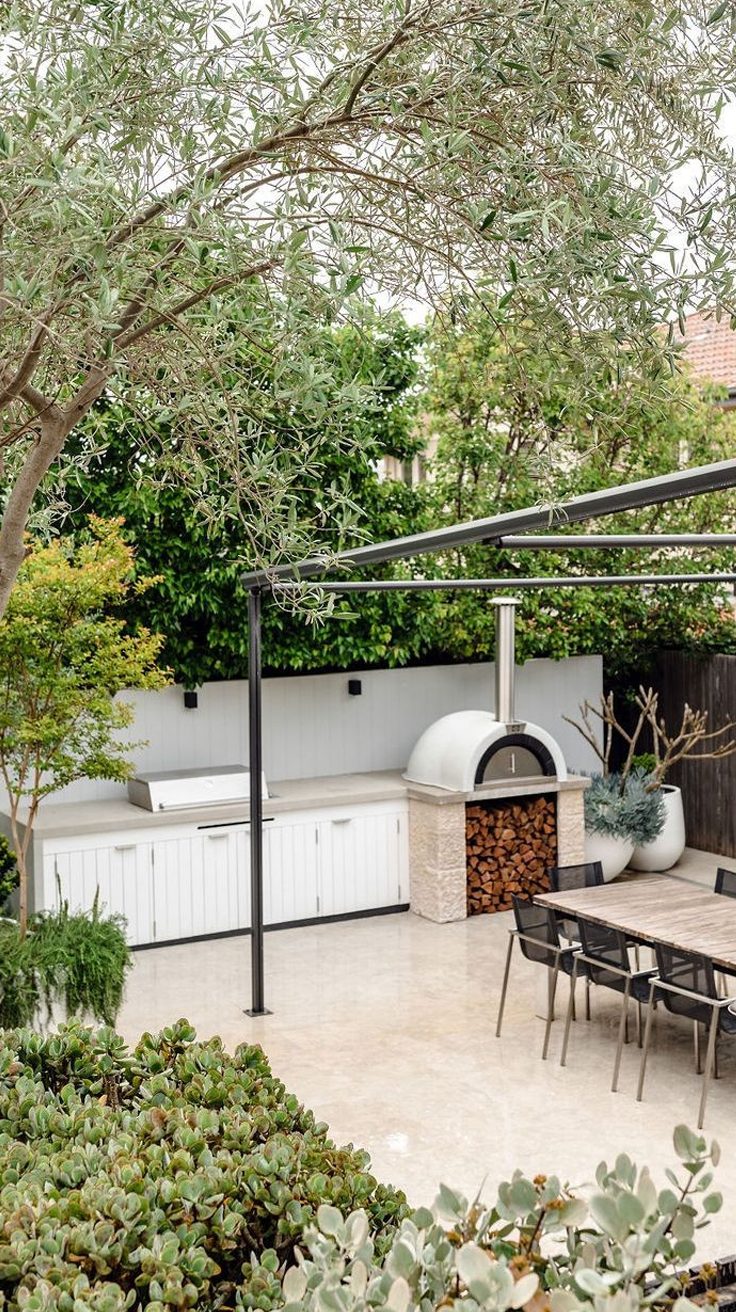 A corner barbecue and pizza oven sit ready for action under the shade. Wooden cabinets offer storage, with a stand for firewood cleverly integrated. Cactus and plantings add a touch of green, breaking up the starkness and adding a cozy vibe. The layout feels fresh, clean, and ready for some al fresco dining.