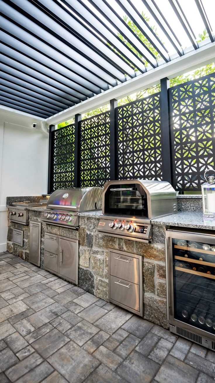 The geometric patterned screen adds a touch of flair and privacy, making the space feel intimate and chic. The built-in wine cooler is an eye-catching detail, keeping everything at the ideal temperature right there on the patio. The stone-tiled floor ties everything together, providing a sturdy base for all your outdoor cooking adventures.