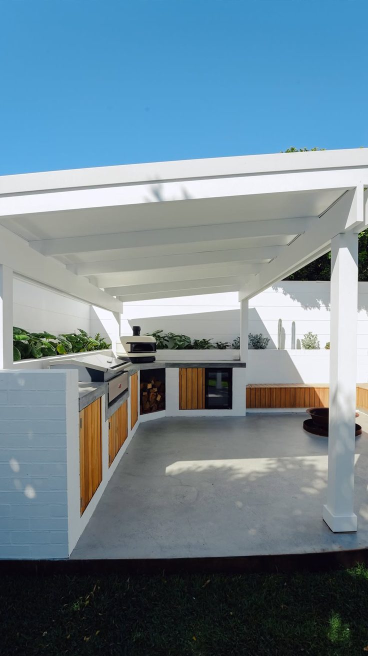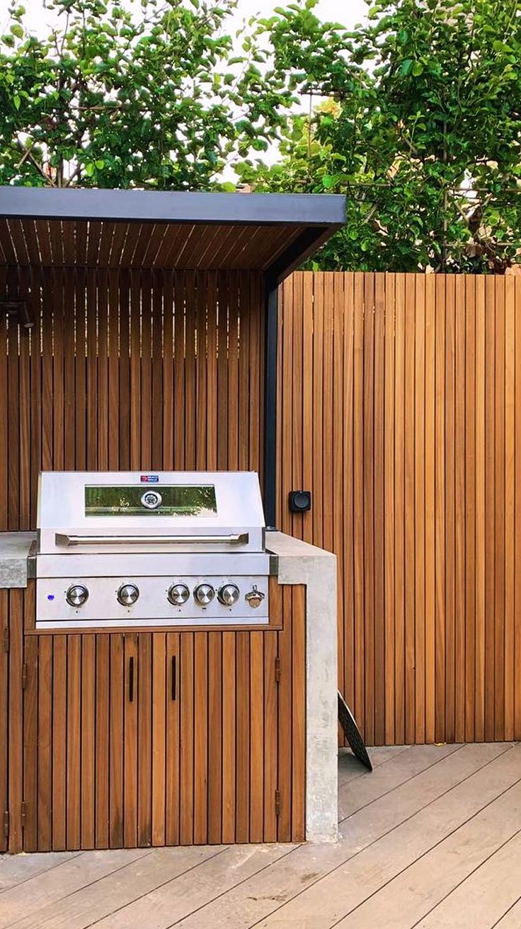 The white paneling creates a clean and contemporary vibe. Nestled next to a few leafy plants, the setup feels both natural and thoughtfully curated. This spot is perfect for hosting, with smart spacing that allows for both cooking and socializing effortlessly. The mix of wood tones and metal touches offer a balanced and appealing outdoor aesthetic.