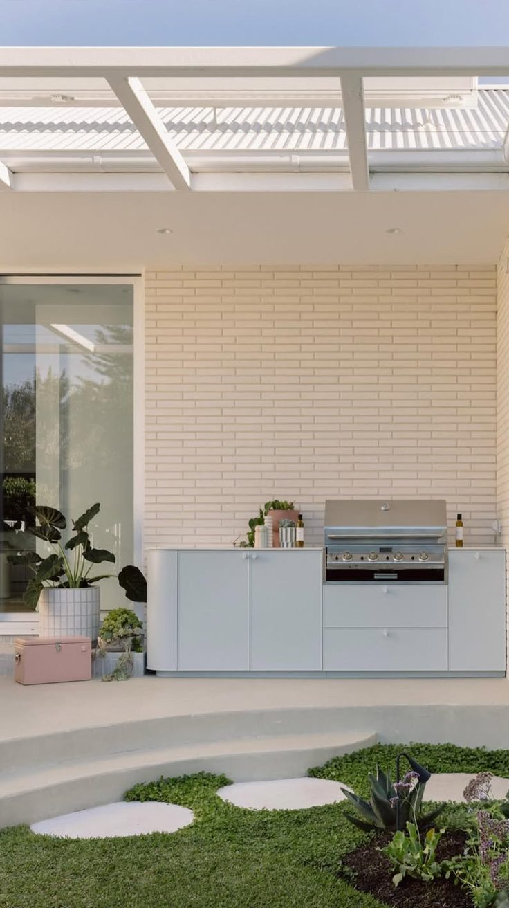 Soft pastel colors give this outdoor area a calm, inviting vibe. A sleek stainless steel grill is centered against a backdrop of light-textured brick. A row of simple white cabinets provides storage and style, maintaining a clean, minimalist look.
