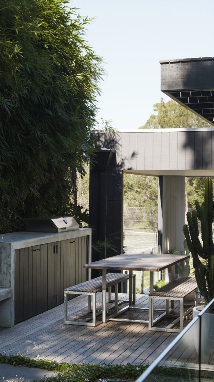 Wooden decking underfoot adds warmth to the space, complementing the cool tones of the stone and metal. This outdoor area strikes a perfect balance between style and functionality, making it a great spot for casual dining or entertaining. It’s the kind of setup that draws you in with its effortless charm.