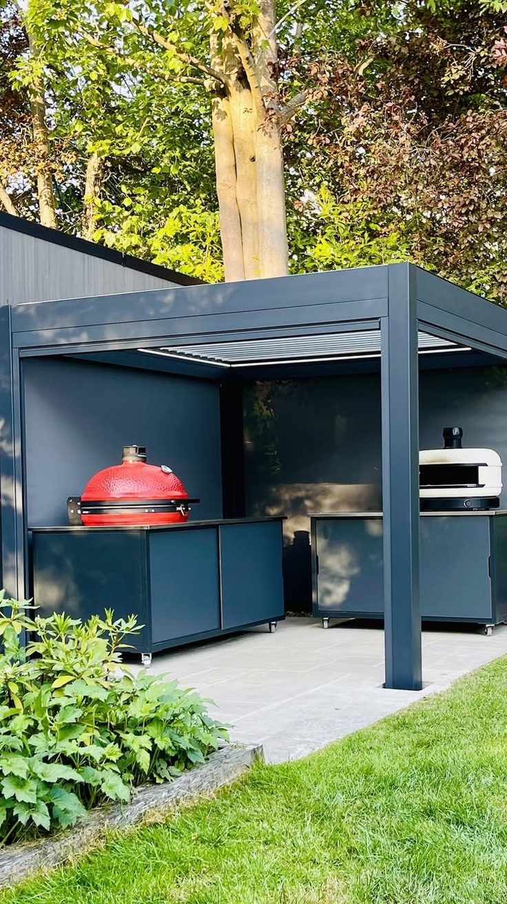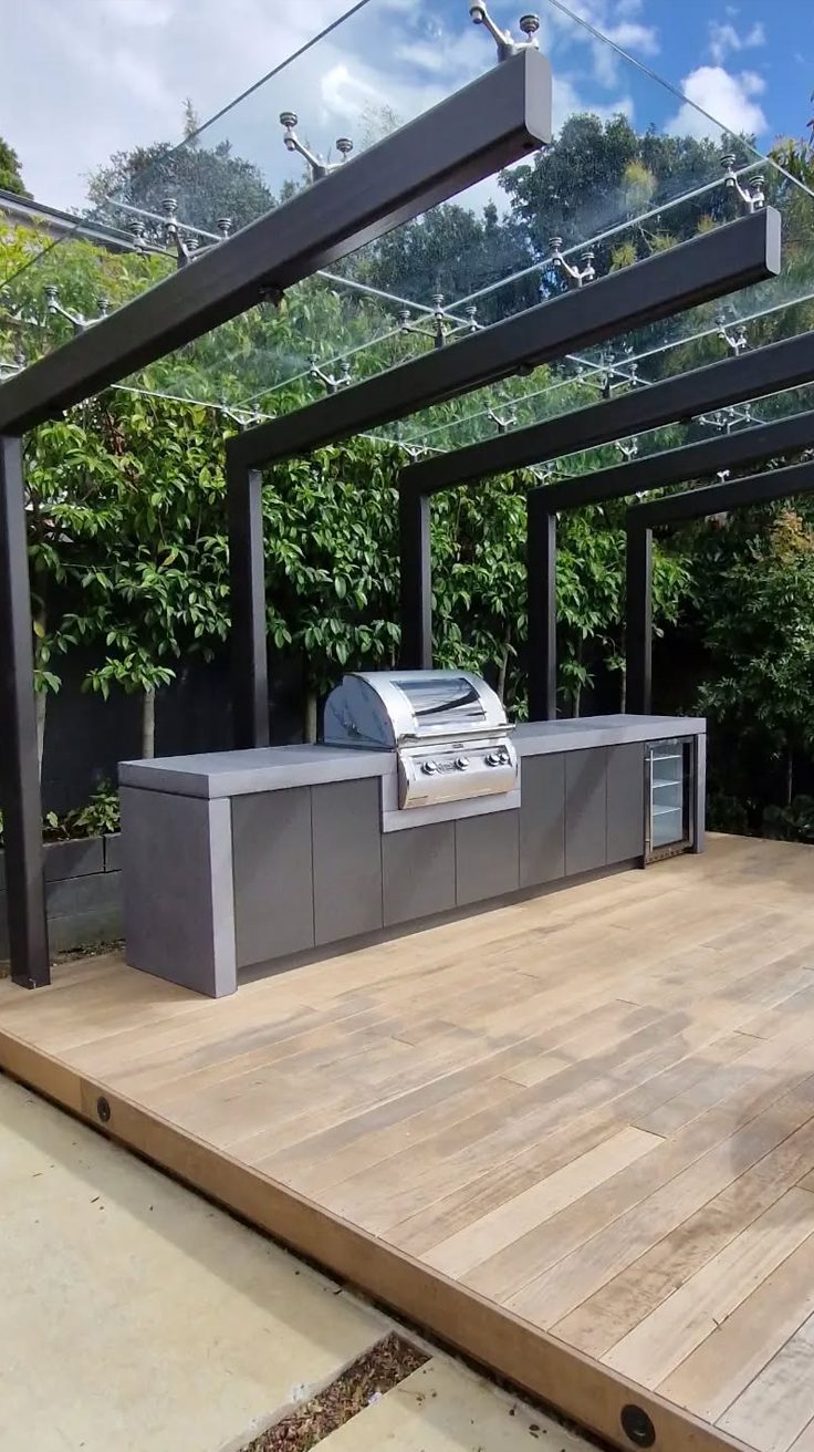 Above, a transparent glass roof provides a touch of elegance, letting in natural light while offering some protection from the elements. The frame has a sturdy, dark finish that complements the greenery surrounding the space. It’s a blend of style and function, making it a spot to enjoy both cooking and the outdoors.