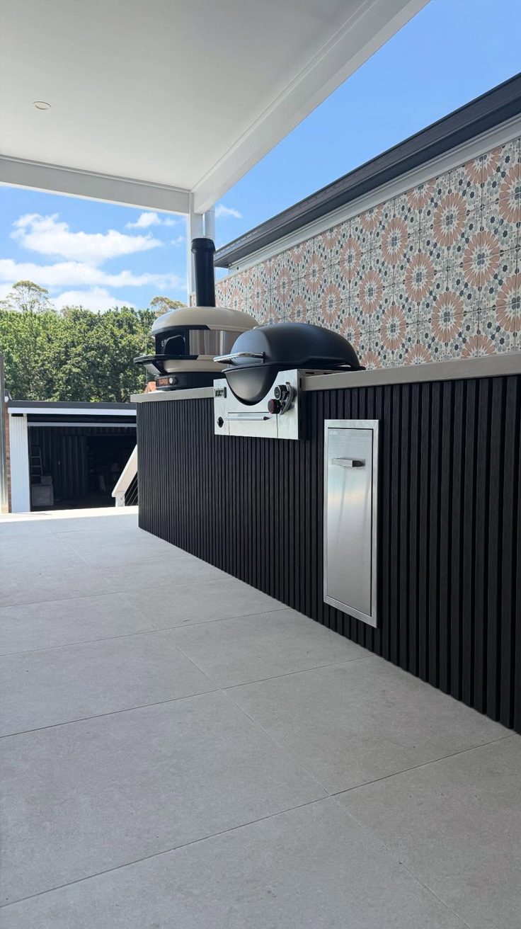 The setup is both functional and stylish, making it an excellent spot for gatherings. With everything neatly arranged, it focuses on both efficiency and aesthetics. The combination of elements shows a smart use of space and materials, creating a practical setting for any outdoor cooking enthusiast.
