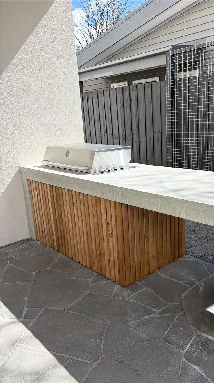 Below, the wooden slats provide a warm contrast to the cool countertop. They give the setup a natural touch, blending seamlessly with the outdoor vibe. The whole look is clean and uncomplicated, perfect for someone who loves a modern, yet inviting outdoor space.