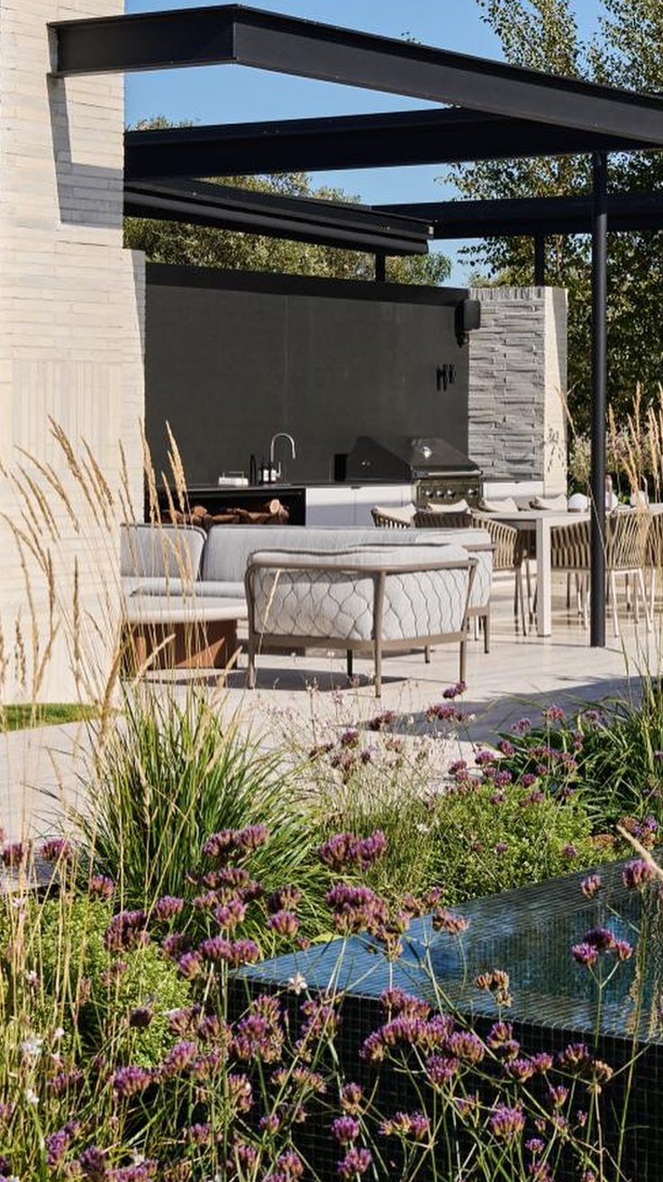 A neat garden bed sits between the kitchen and the lawn. Small, tidy plants add a touch of nature and color without overwhelming the space. It’s all laid out on geometric paving, pulling the whole look together with a clean, polished finish.