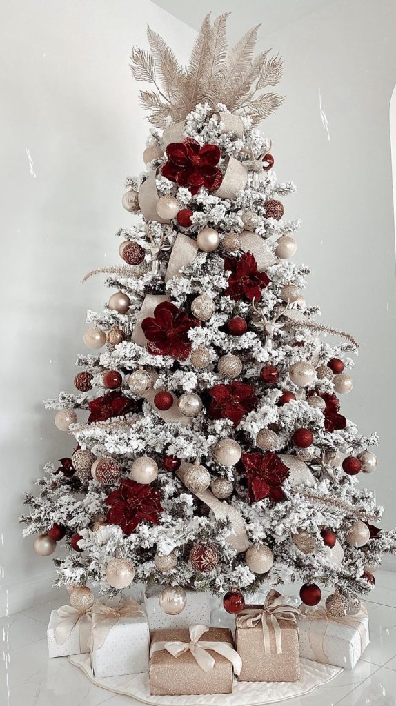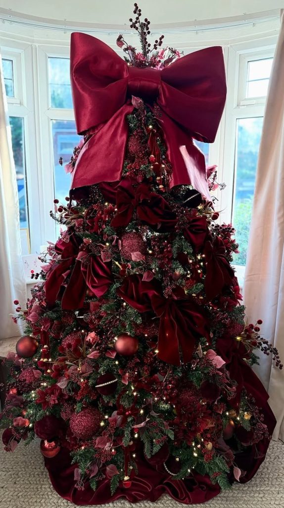 Your tree can become the centrepiece by using black baubles alongside deep jewel tones. Consider adding pearl-detailed accessories or oversized satin bows as tree toppers for extra glamour.