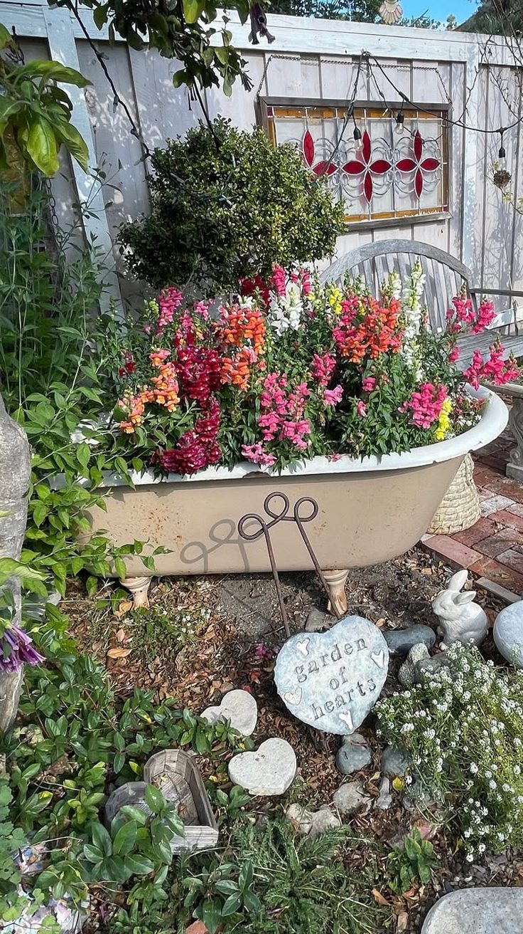 The backdrop of a stained glass window adds a touch of elegance with its red and clear panes. Around the bathtub, heart-shaped stones are scattered playfully among the greenery. This setup is both creative and charming, infusing everyday items with a sense of whimsy.