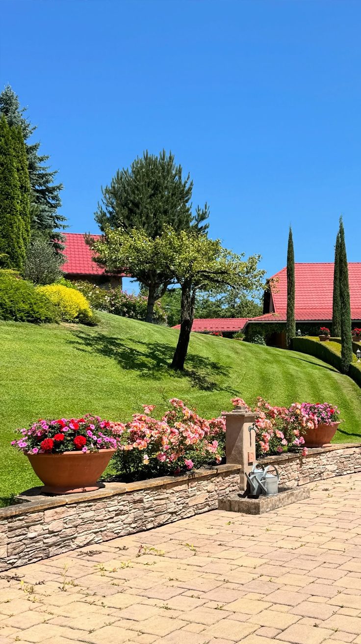 A vivid blue sky stretches out above a perfectly manicured garden, setting a serene scene. The lush green lawn rolls gently downward, contrasting with bright red roofs in the background. Tall, slender trees punctuate the space, adding height and elegance to the landscape.