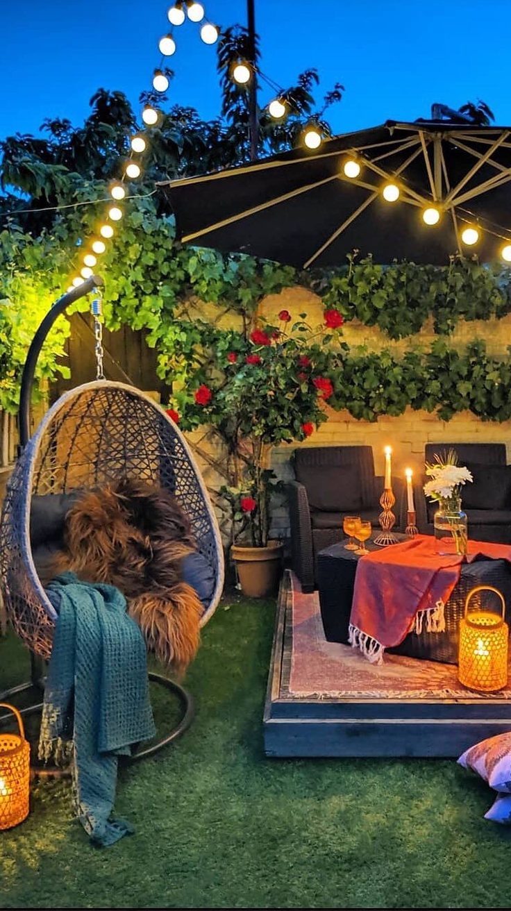 String lights zigzag above, creating a warm glow against the deepening blue sky. They curve down to meet a bohemian hanging chair draped with a teal blanket. The chair is invitingly cushioned, nestled near softly glowing lanterns on the green grass.