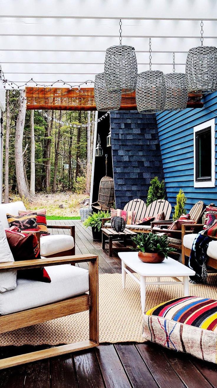 Oversized wicker lanterns hang from a white pergola, casting soft shadows on the deck below. The natural weave pattern adds a rustic touch that feels perfect for this outdoor setting. They’re strung above a collection of comfy wooden patio chairs and sofas, wrapped in colorful cushions.
