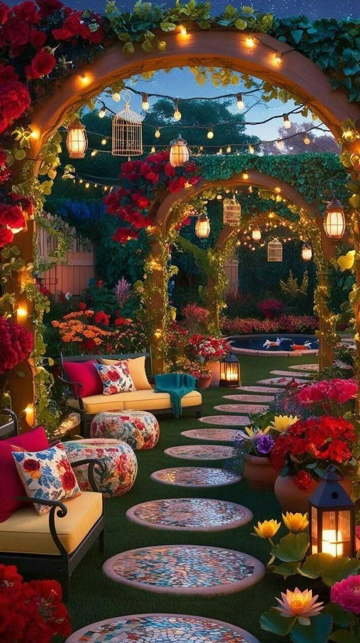 Colorful stepping stones lead you down a path through a magical garden. They’re surrounded by vibrant flowers that pop against the lush grass. Overhead, strings of fairy lights and lanterns provide a warm glow, creating a cozy atmosphere.