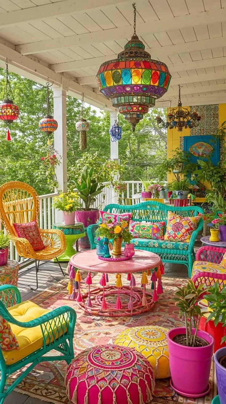 Teal wicker seating dotted with bright, patterned pillows creates an inviting spot to relax. A round pink table sits at the center, adorned with colorful tassels that sway gently if there’s a breeze. Nearby, potted plants in purple and pink containers add a touch of greenery and life to the scene.