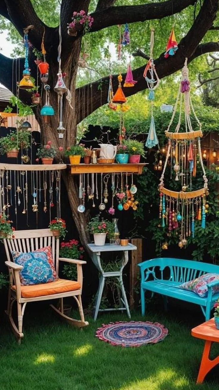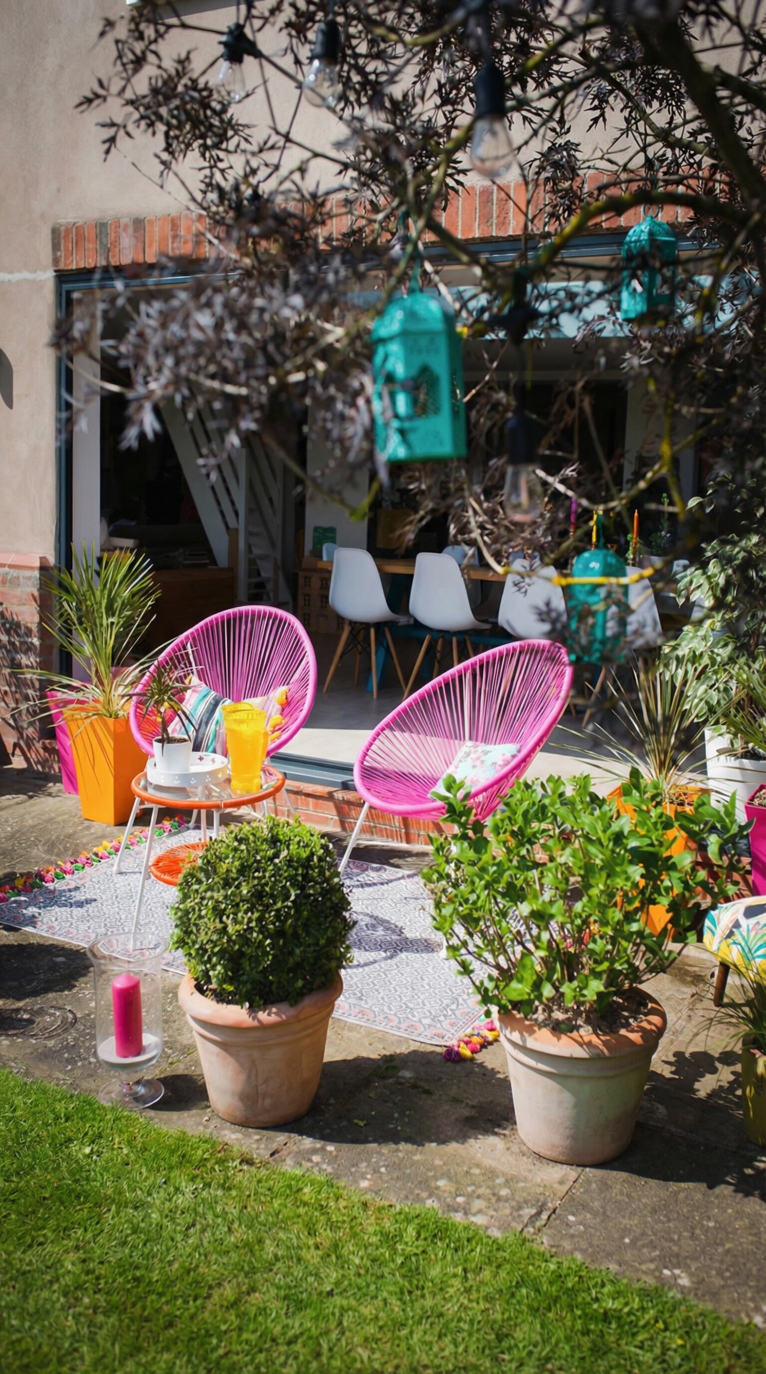 Colorful lanterns hang from the tree branches, casting a playful vibe across the scene. Each lantern and decoration is a burst of color that blends perfectly with the lush, green backdrop. The vibrant, mismatched pots filled with blooming flowers add a fresh and lively touch, pulling everything together seamlessly.
