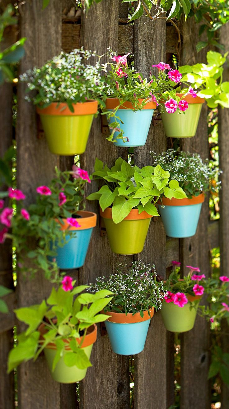 A rustic wooden fence comes alive with an array of vibrant flower pots. Each pot pops with either a refreshing lime green or a calming sky blue, perfectly complementing the lush greenery and bright pink blooms inside. The arrangement feels both organized and spontaneous, bringing a lively energy to the outdoor space.
