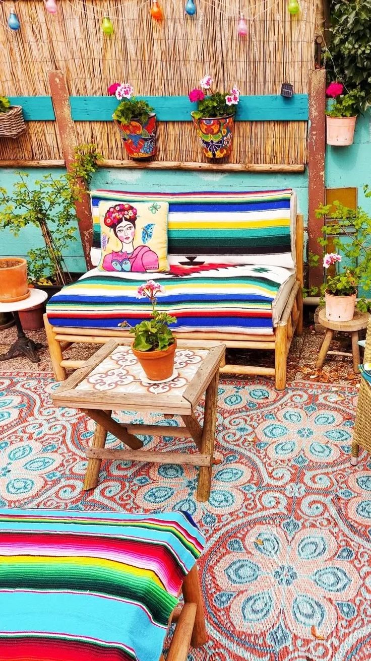 The explosion of colors in this outdoor nook catches your eye immediately. Bright stripes cover the seating, layered with a bold Frida Kahlo cushion that adds a quirky touch. A patterned rug on the ground ties it all together, blending red and blue tones in a floral motif.