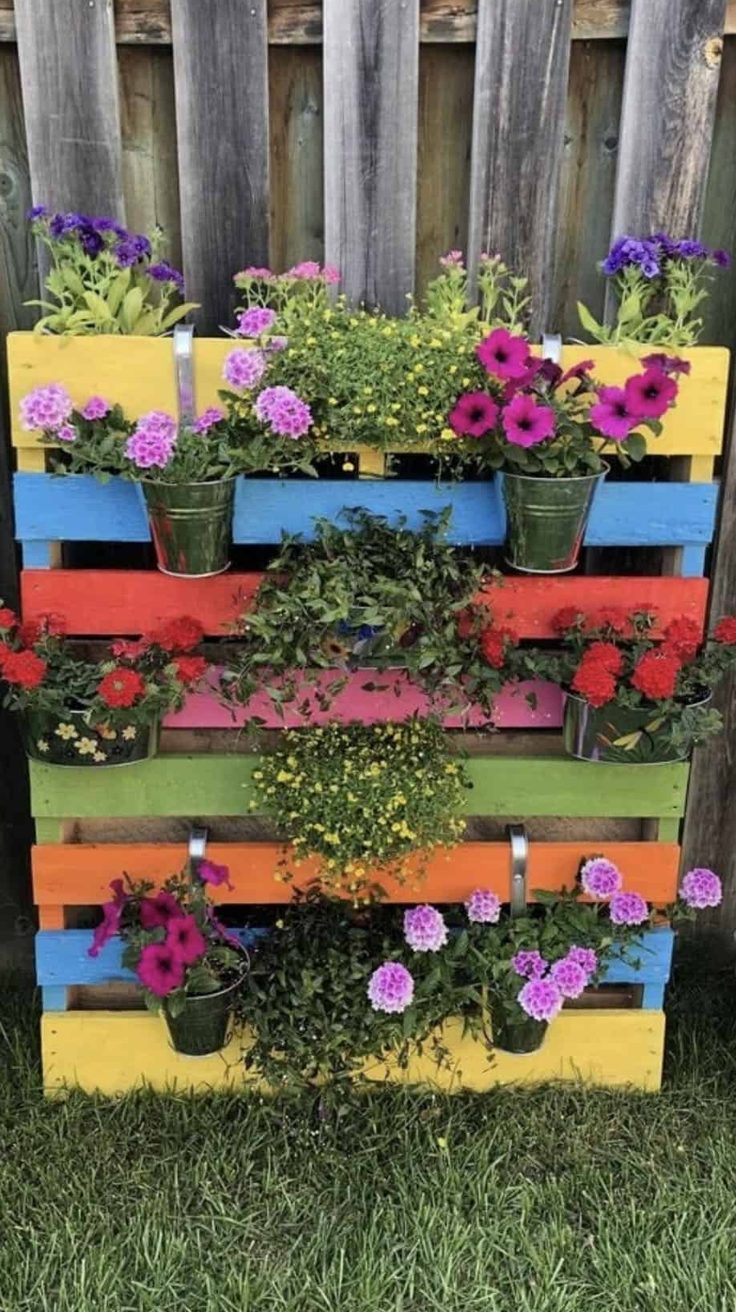 Bold colors jump out right away. A wooden pallet painted in vibrant stripes of yellow, blue, orange, pink, and green transforms into a vertical garden. Small metal pots hang off the edges, each bursting with colorful flowers like purple petunias and red blooms. It’s a simple yet striking setup against a wooden fence backdrop.