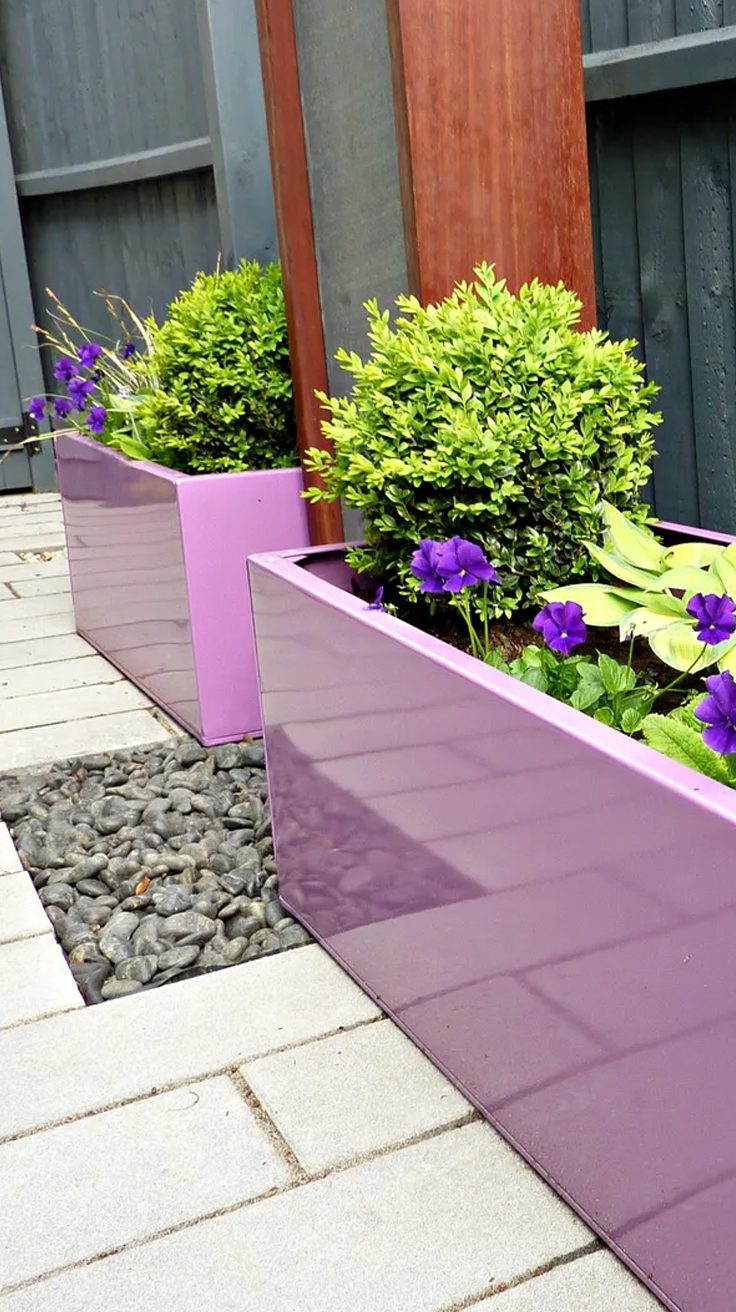 Bright purple planters immediately catch your eye with their glossy finish. They stand out against the muted grey patio stones around them. The plants inside add a nice contrast with their deep green leaves and vibrant purple flowers.
