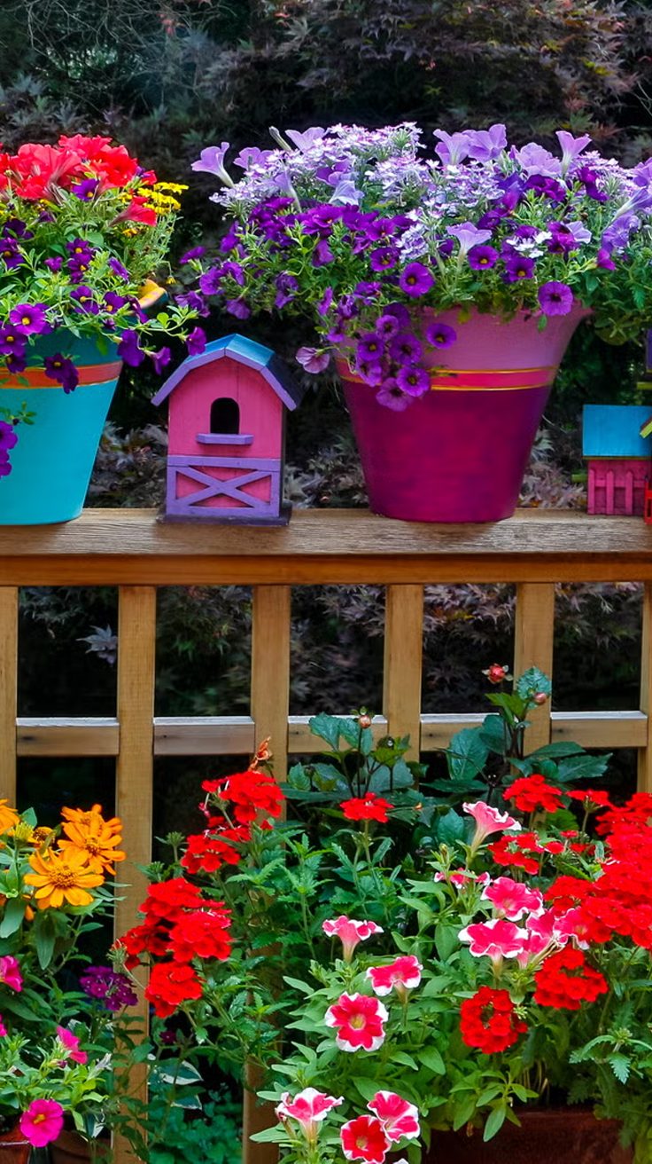 A vibrant display catches the eye with two large pots bursting with purple and red flowers. Both pots sit sturdily on a wooden railing, creating an inviting splash of color. Between them is a small, cheerful birdhouse painted in bright pink and blue, adding a quirky charm to this garden scene.
